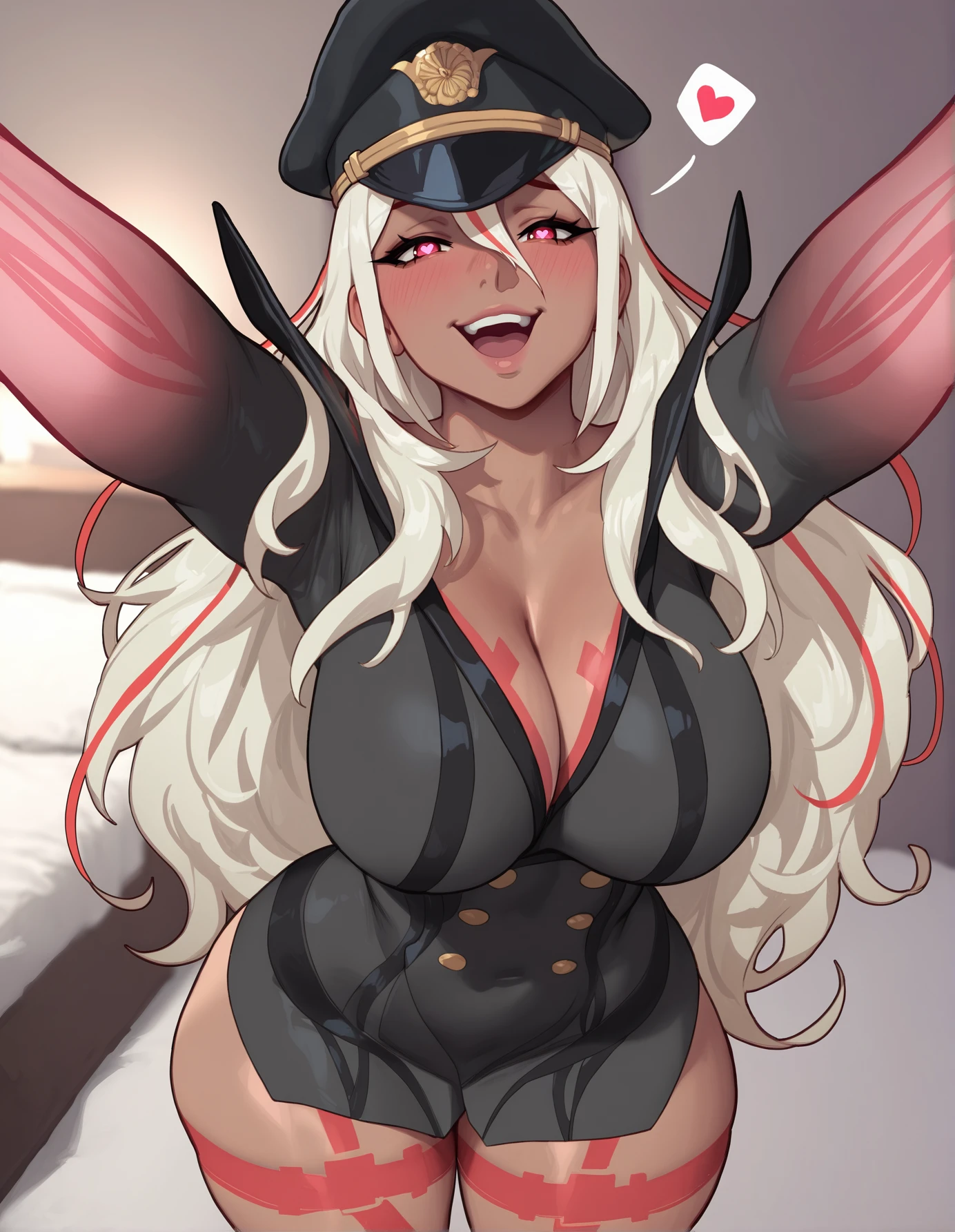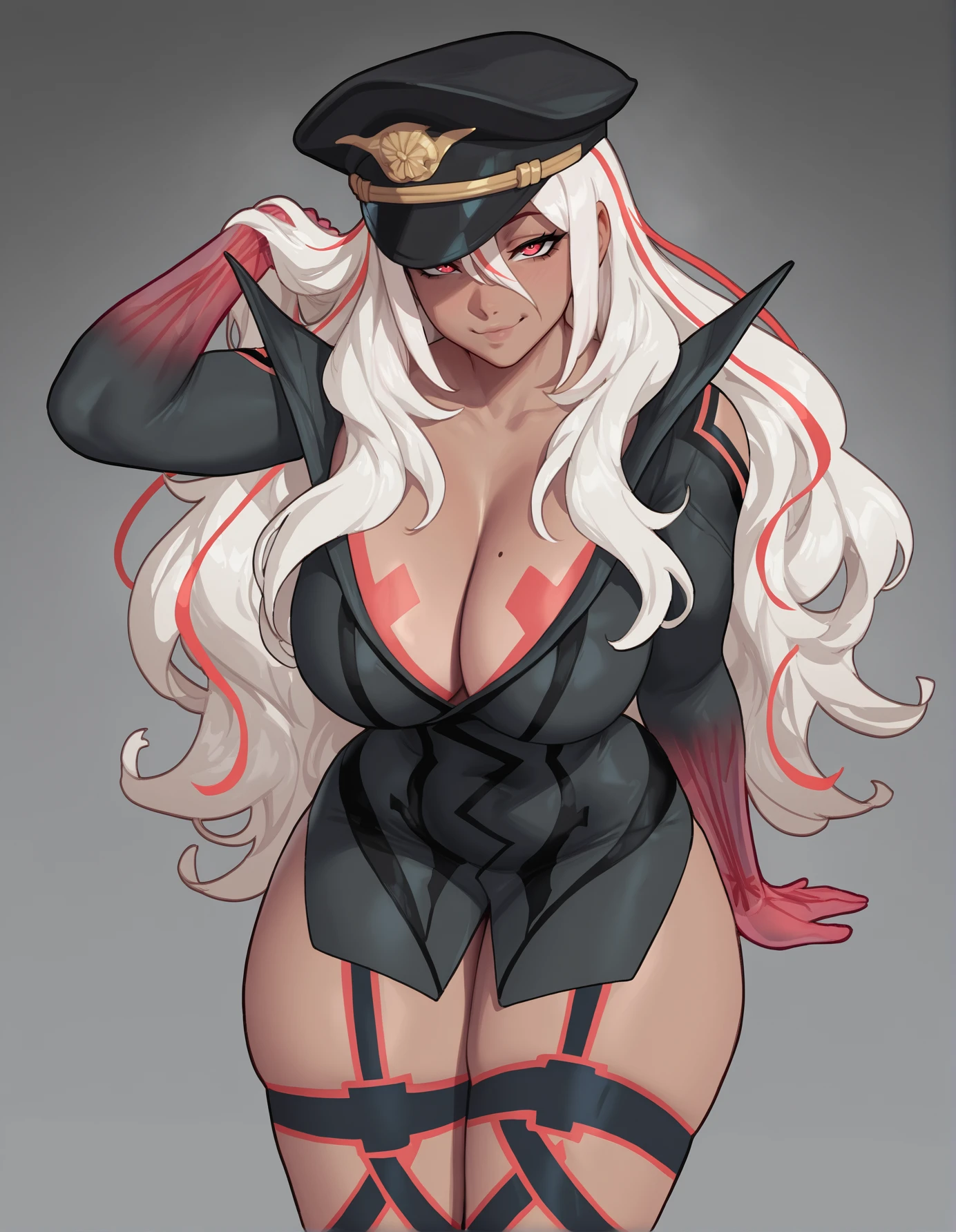 " tamadef, peaked cap, military hat, red eyes, dark-skinned female, dark skin, streaked hair, hair between eyes, red hair, body markings, multicolored hair, see-through body, large breasts, black headwear,black dress,short dress"