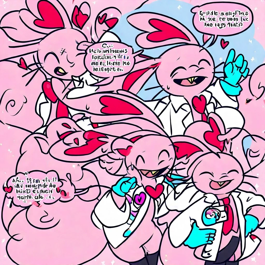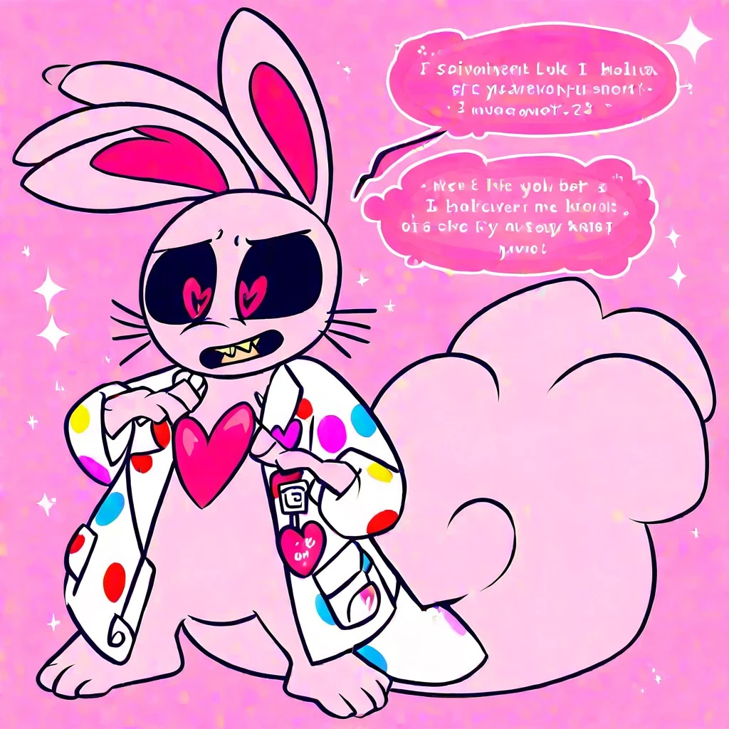 anthro, furry male, pink skin, colored skin, heart-shaped ears, animal ears, stitched ears, whiskers, black sclera, colored sclera, pink eyes, heart-shaped pupils, yellow teeth, buck teeth, large tail