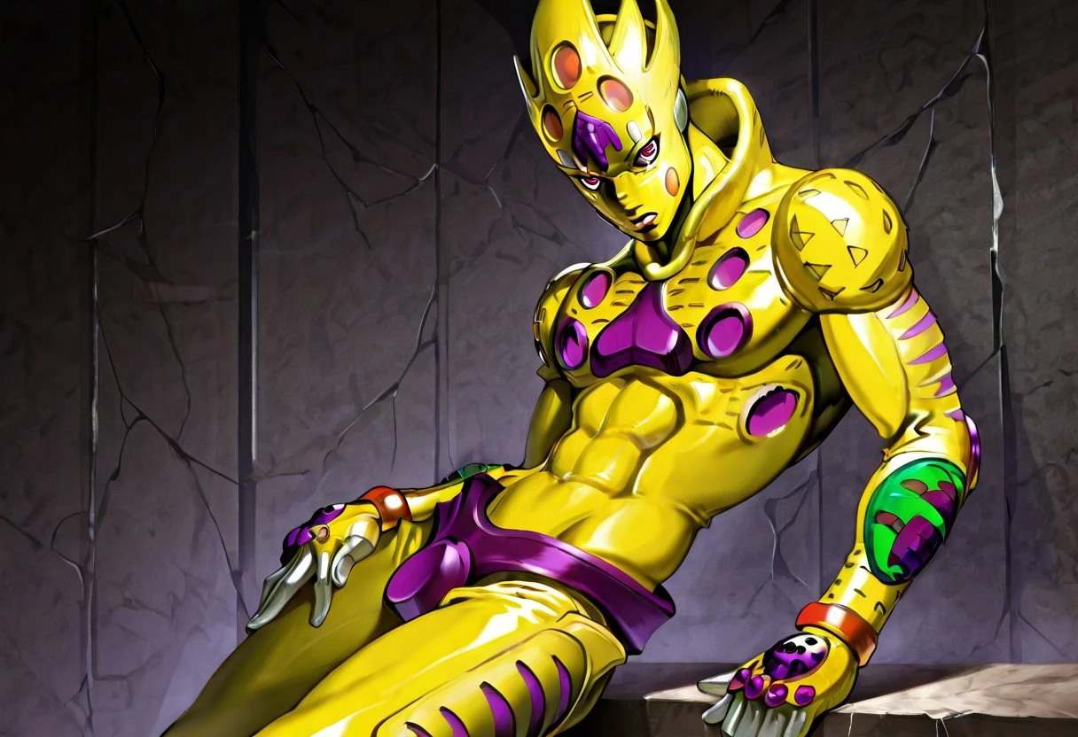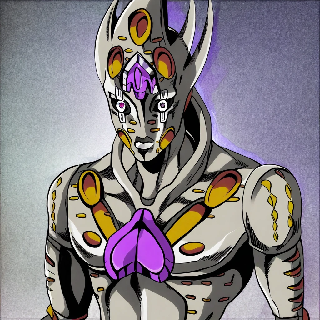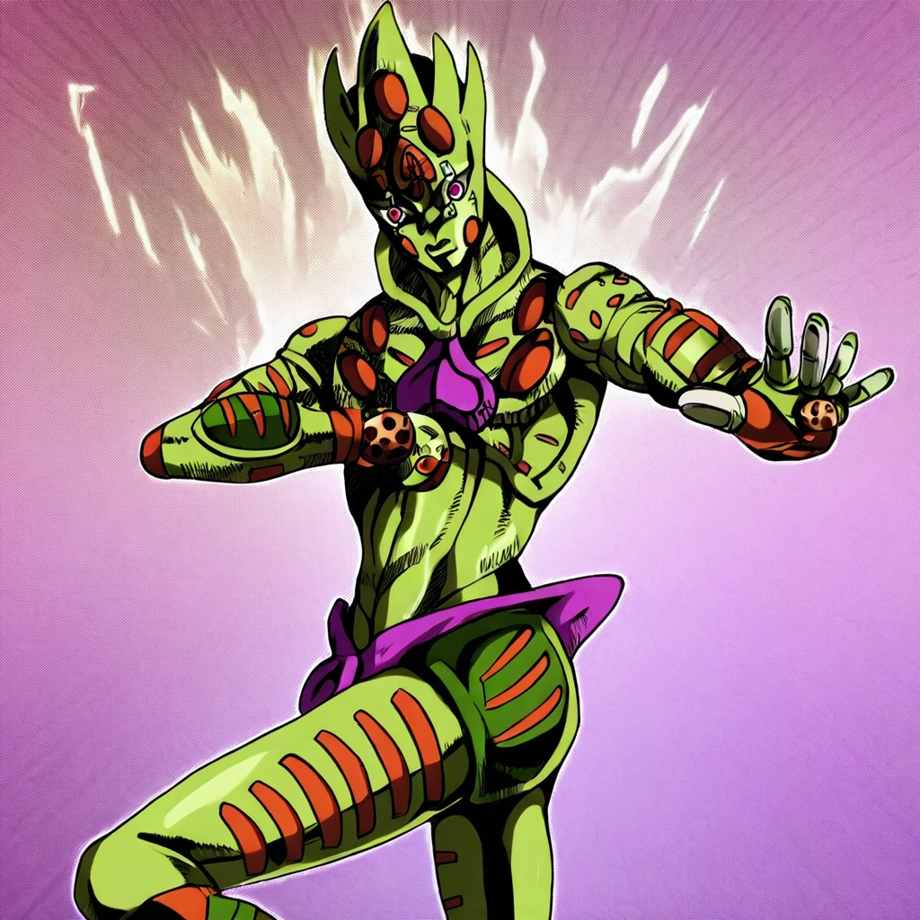 gerjojo, stand (jojo), 1boy, solo, yellow body, purple arrow, pink eyes