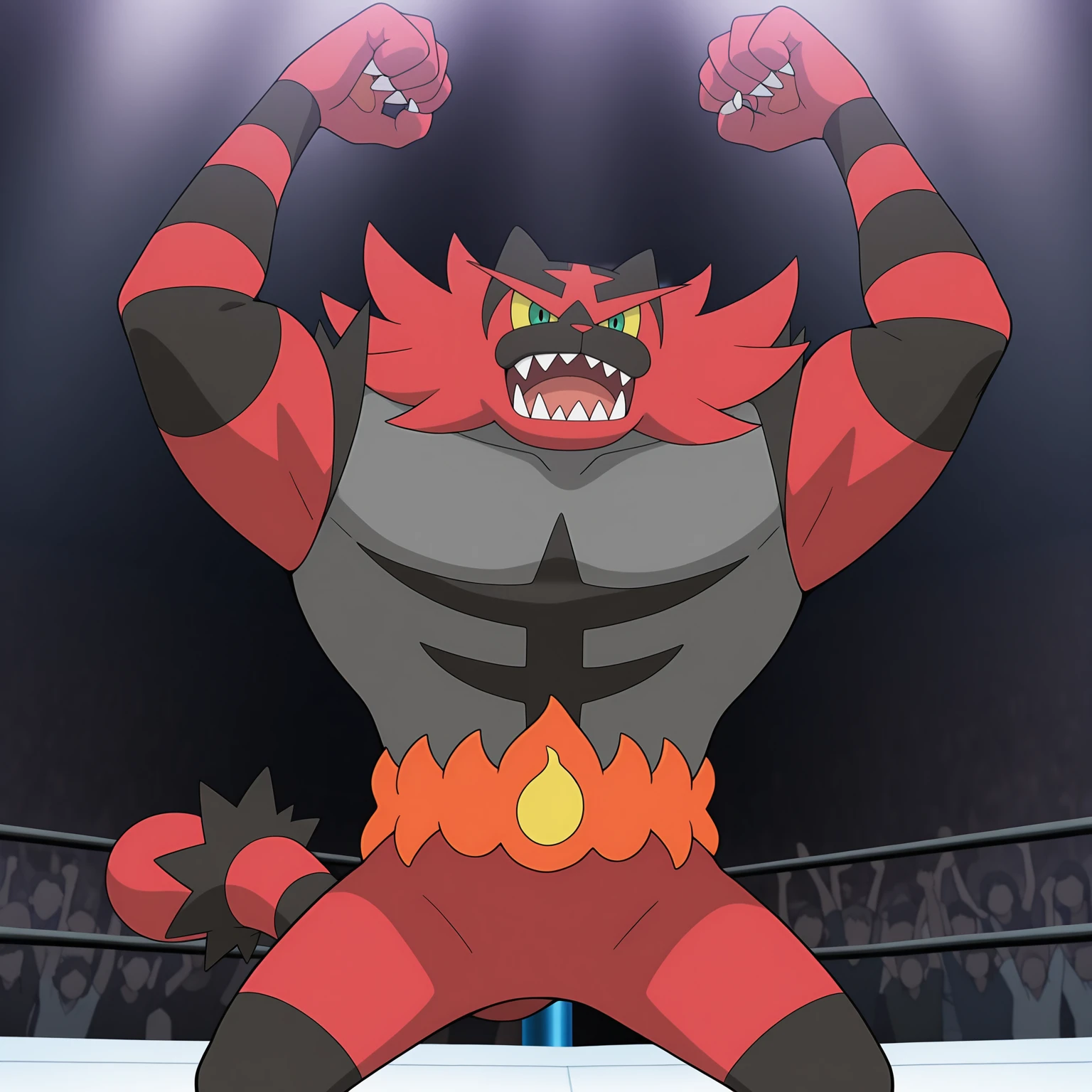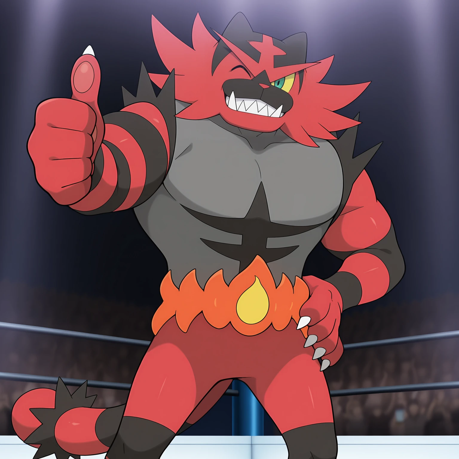 1boy, male, pokemon (creature), furry, anthro, feline, tiger-like, solo, red fur, black fur, striped fur, two-tone fur, green eyes, yellow sclera, pointed ears, red nose, sharp teeth, sharp claws, tail, pawpads, muscular