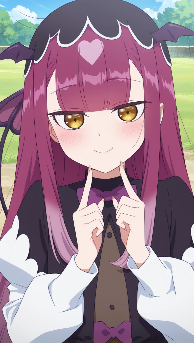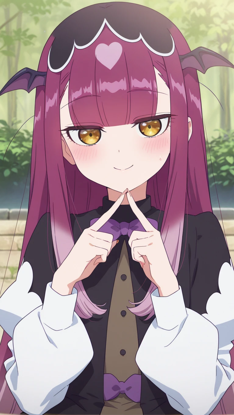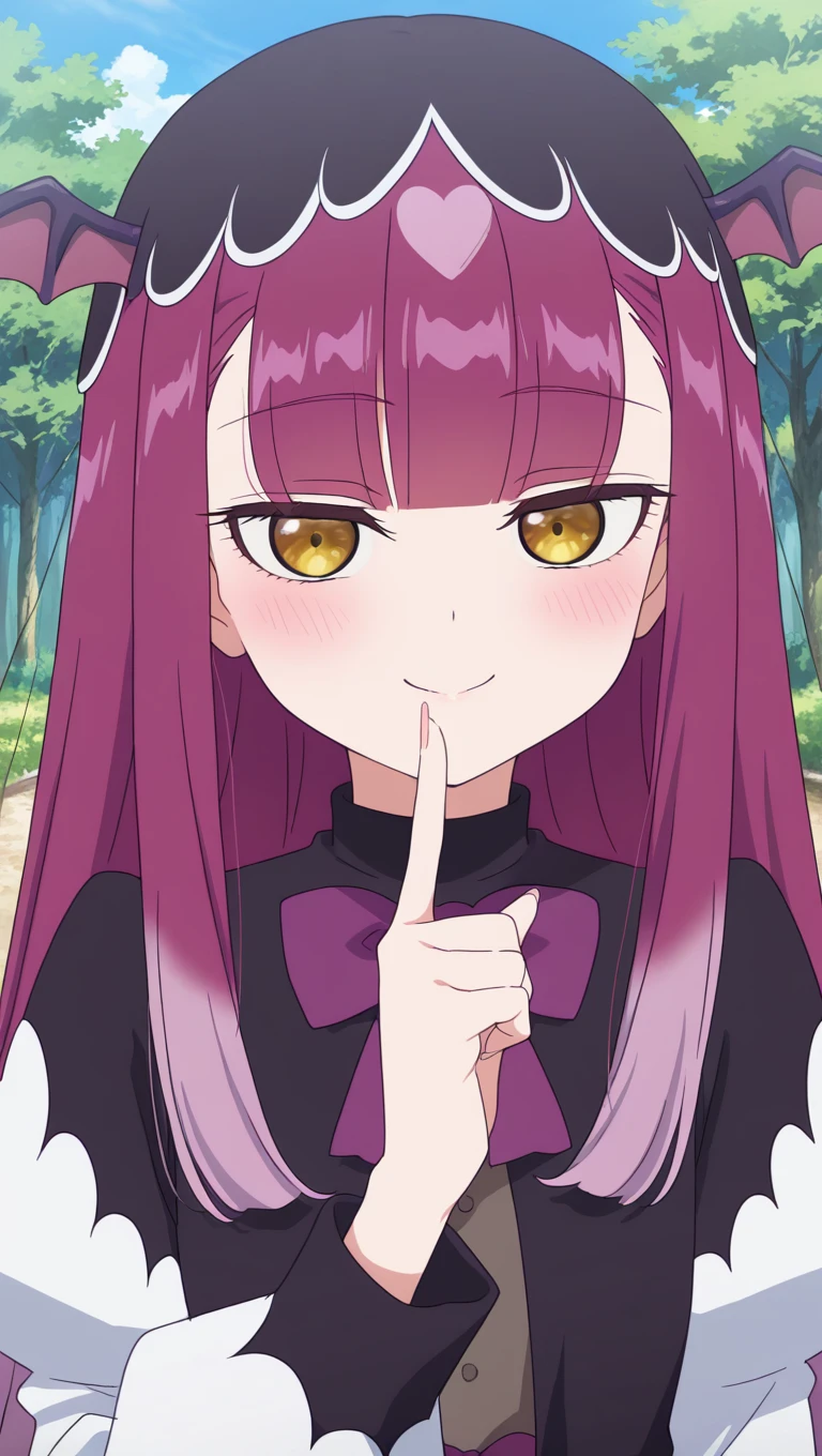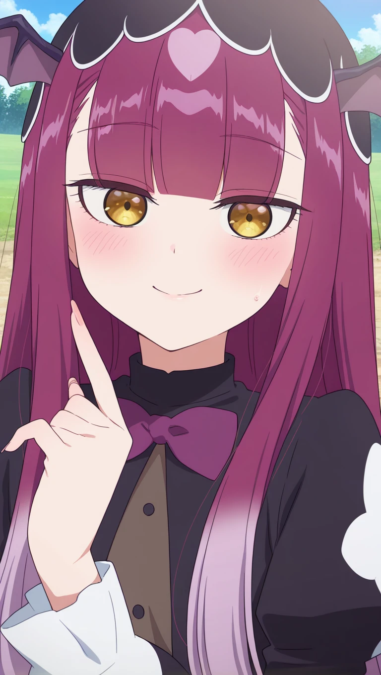 head wings,very long hair,purple hair,blunt bangs,yellow eyes