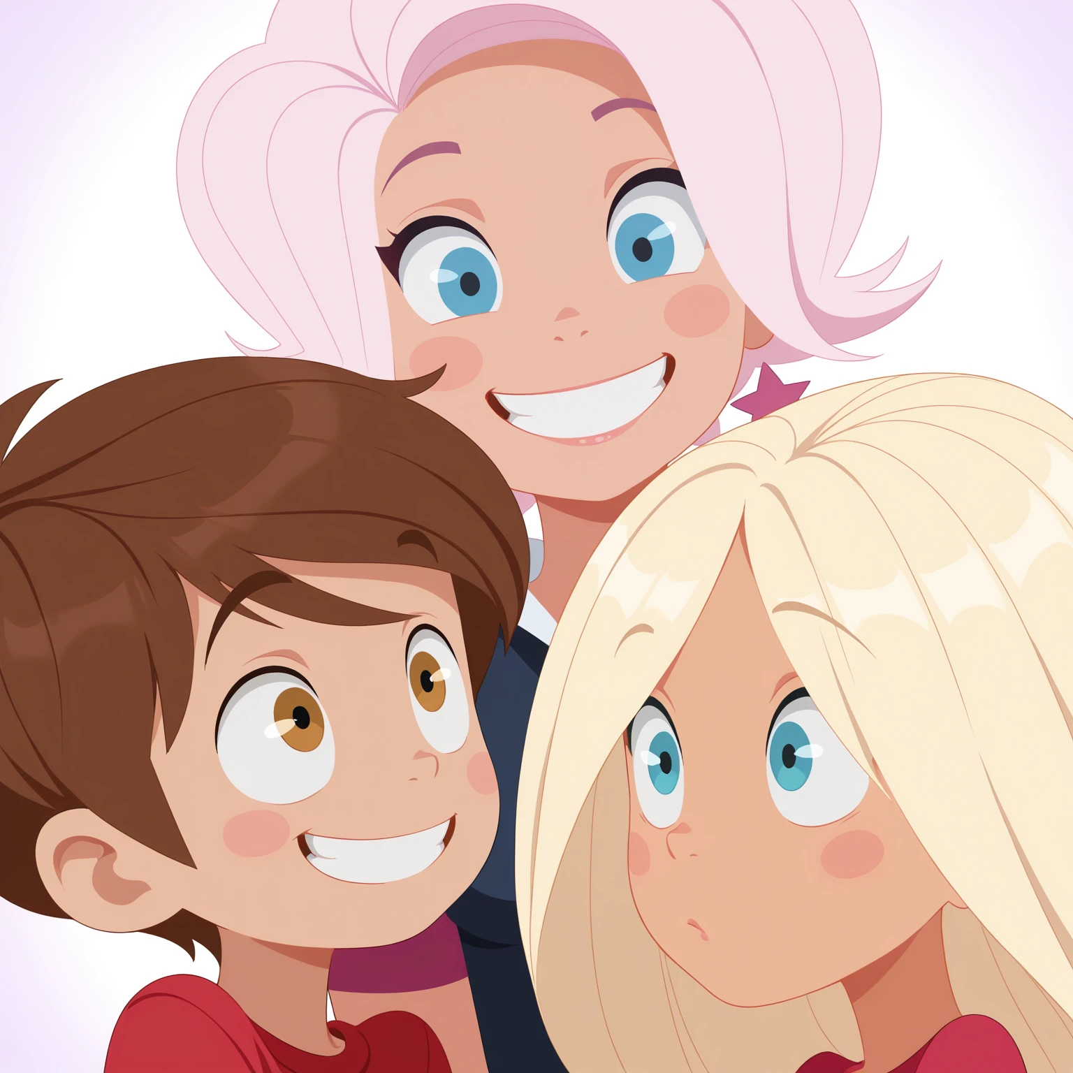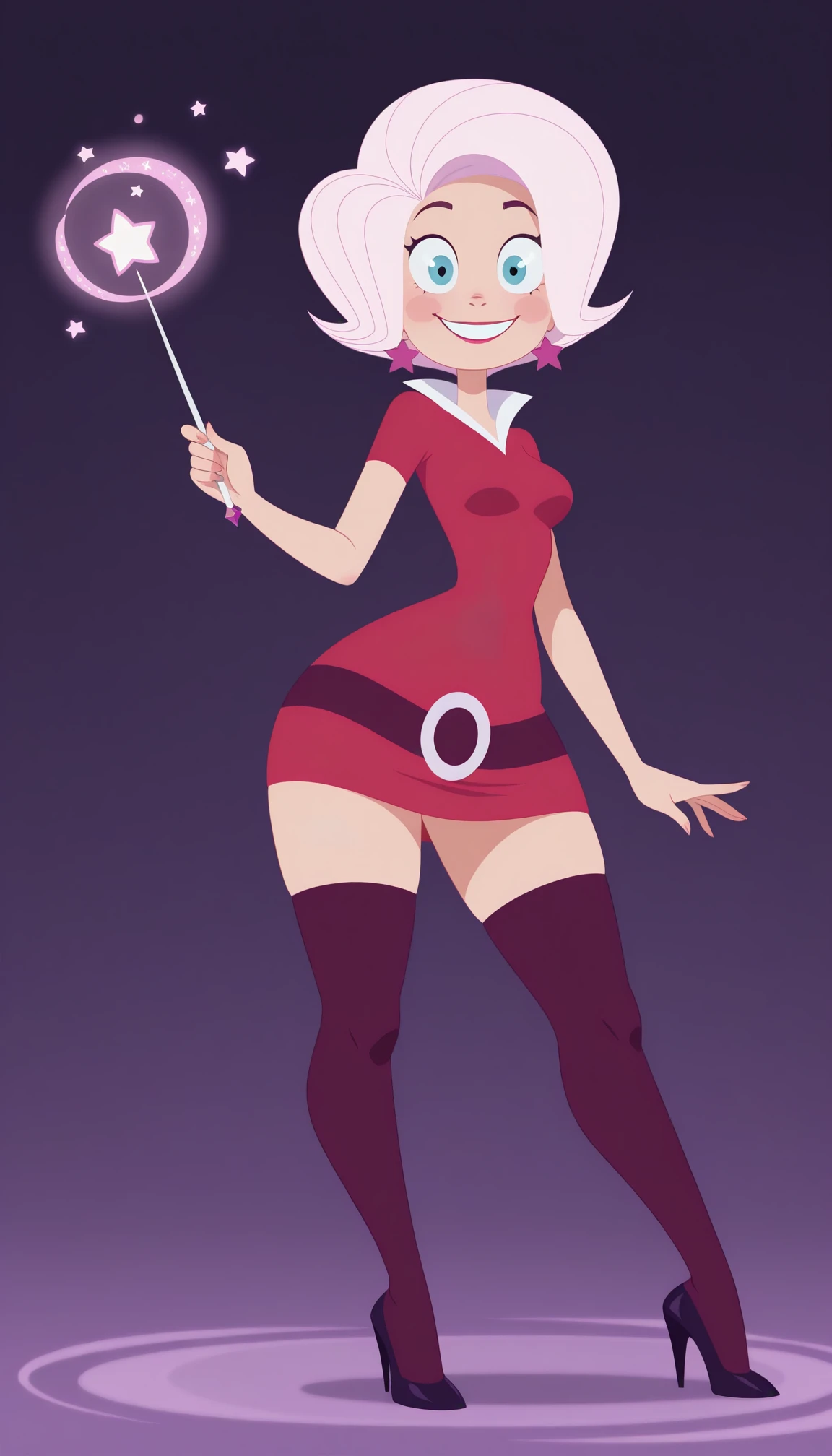 akom, willow, toon (style), 1girl, solo, star earrings, // red dress, short dress, thighhighs, high heels, //, yellow camisole, green pants,