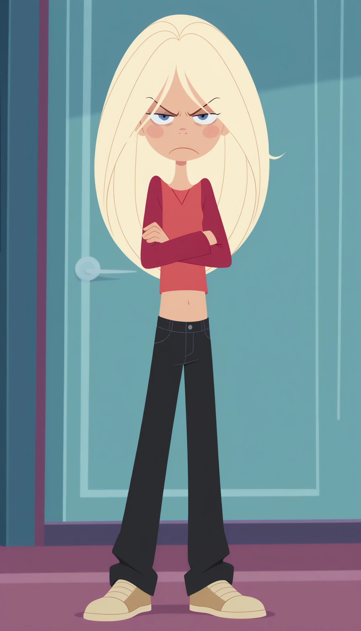 akom, cindy, toon (style), 1girl, solo, // red shirt, long sleeves, crop top, midriff, black pants, shoes // blue bikini // pajamas, // green camisole, red panties