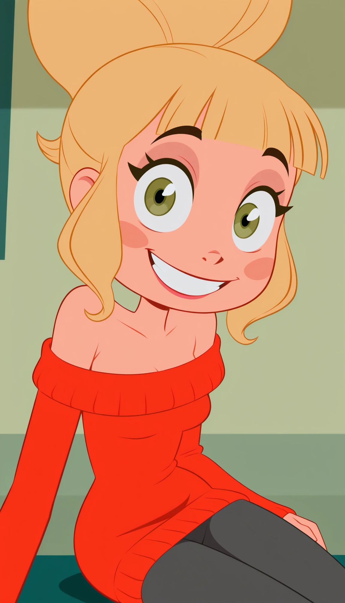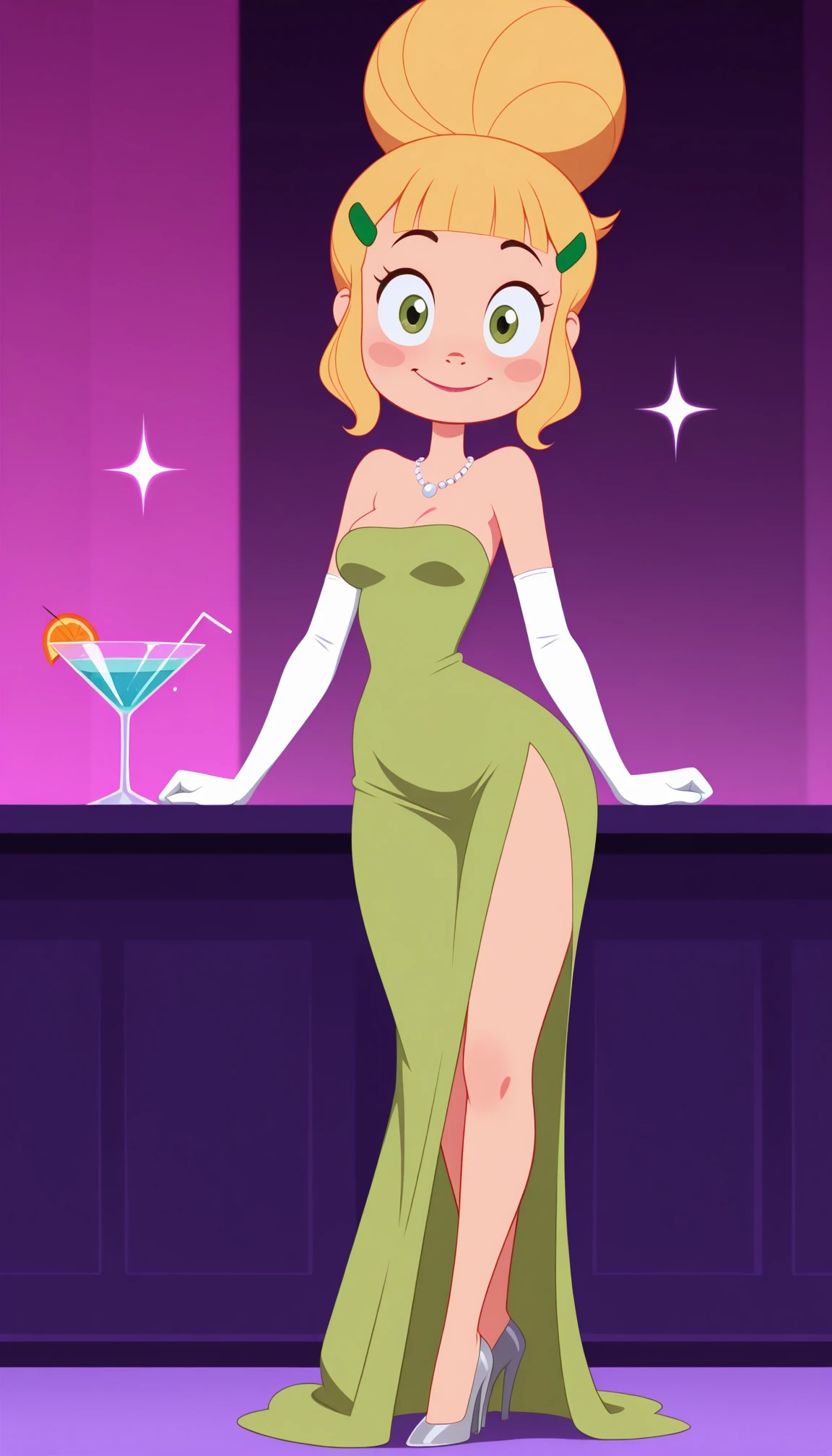 akom, tinker, toon (style), 1girl, solo, // off-shoulder sweater, red sweater, black leggings, // green dress, strapless dress, cocktail dress, side slit, elbow gloves, white gloves, necklace, hairclip