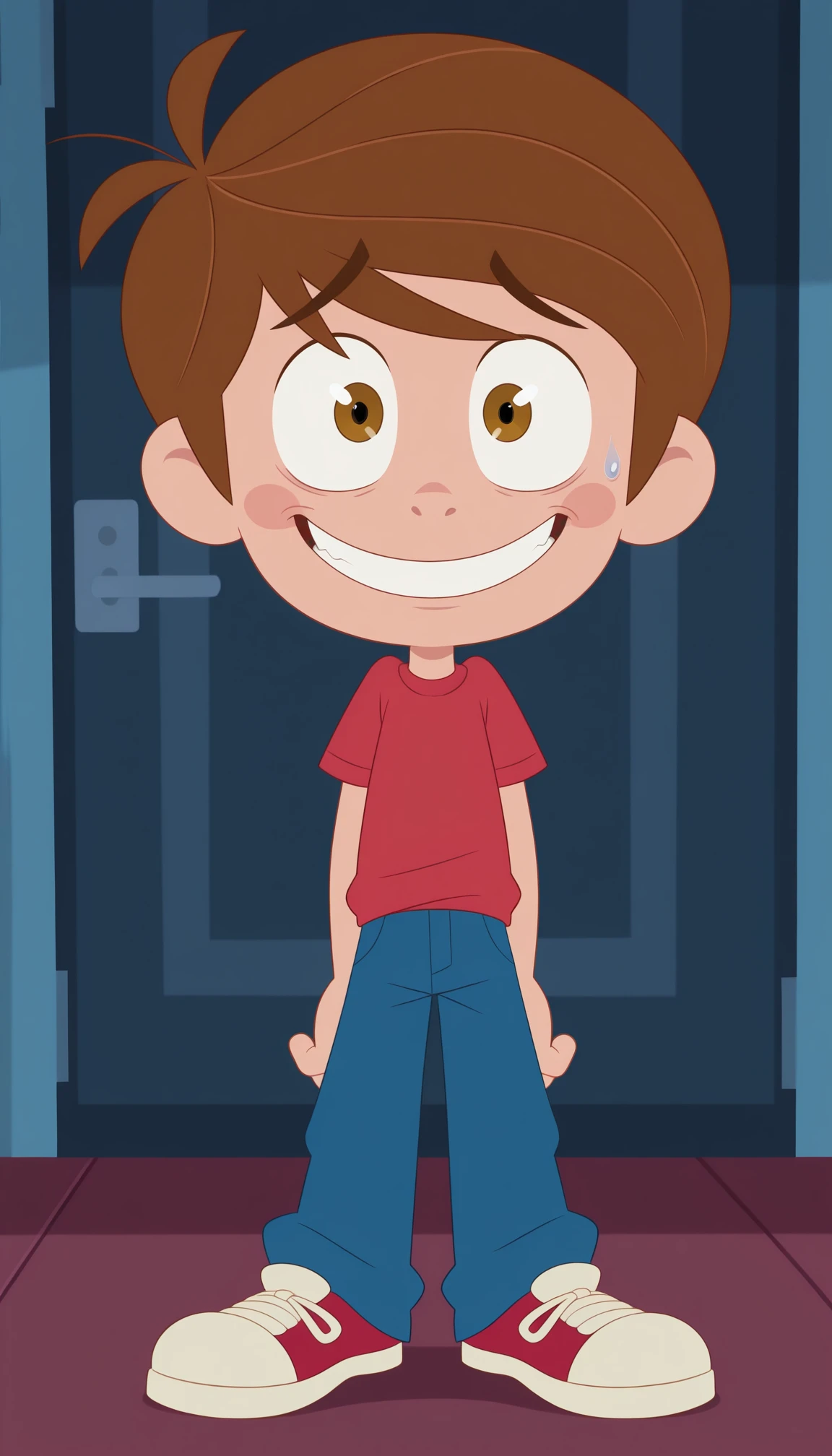 akom, tom, toon (style), 1boy, solo, // red shirt, short sleeves, blue pants, shoes, // red swim briefs, // pajamas
