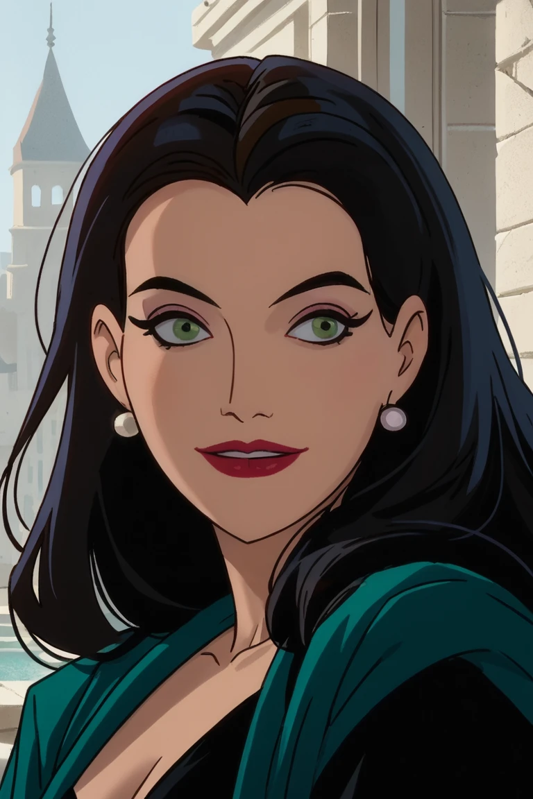 Selina Kyle: Selina_Kyle, 1girl, female, long hair, black hair, green eyes, earrings, red lips, jewelry