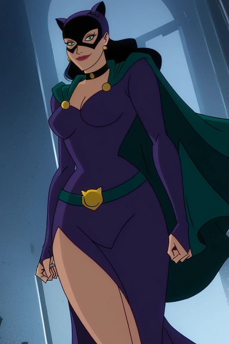 Catwoman: Cat_woman, 1girl, female, catwoman mask, catwoman_dress, green eyes, long hair, black hair, cleavage, jewelry, earrings, choker, belt, cape, mask, domino mask