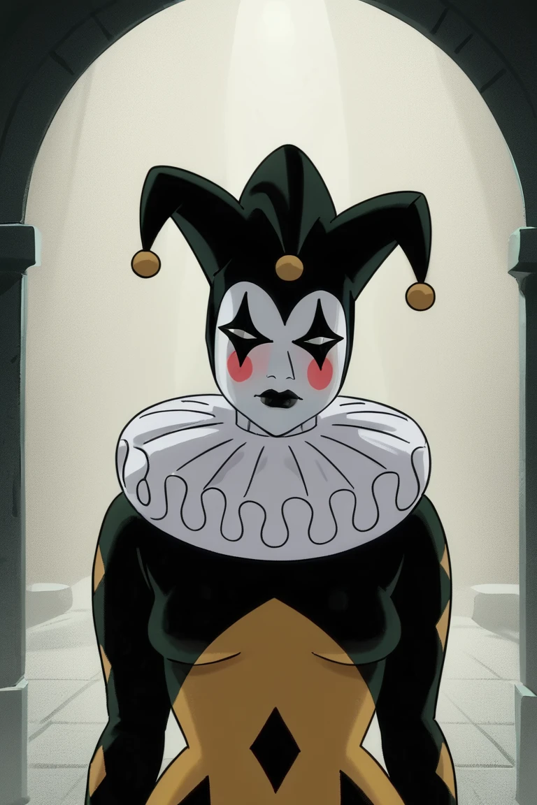 Harley Quinn: Harley_Quinn, 1girl, female, jester jumpsuit, harley_Mask, blush, hat, blush stickers, jester cap, gloves