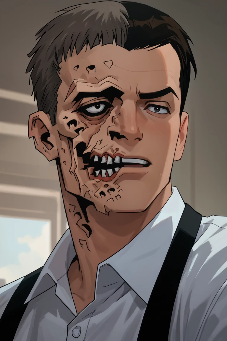 Two-Face: Two_Face, 1boy, male, short hair, suit, black hair, white shirt, collared shirt, black eyes, tie