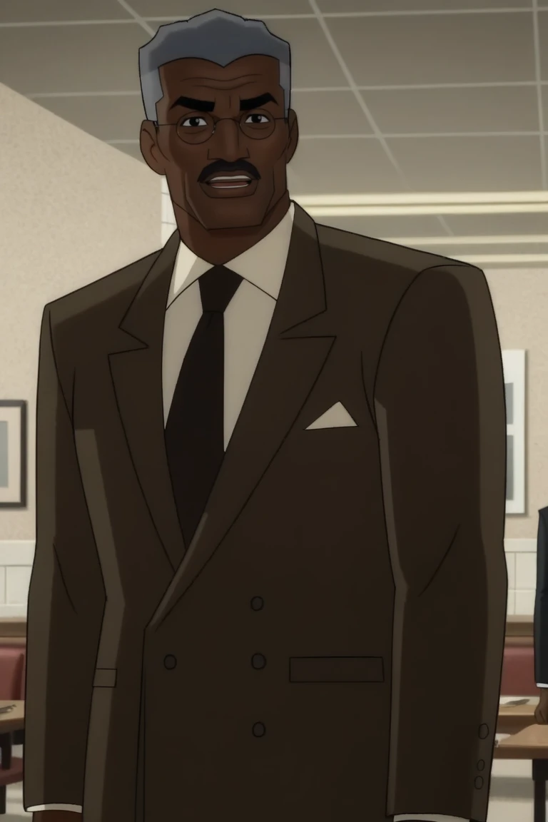 Commissioner Gordon: Jim_Gordon, 1boy, male, grey hair, mustache, dark-skinned male, short hair, jacket, white shirt, glasses, black eyes, facial hair