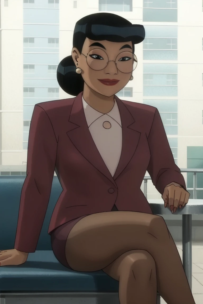 Doctor Quinzel: Doc_Quinzel, 1girl, female, shirt, black hair, jacket, white shirt, earrings, glasses, hair bun, makeup, formal suit, lipstick, round eyewear