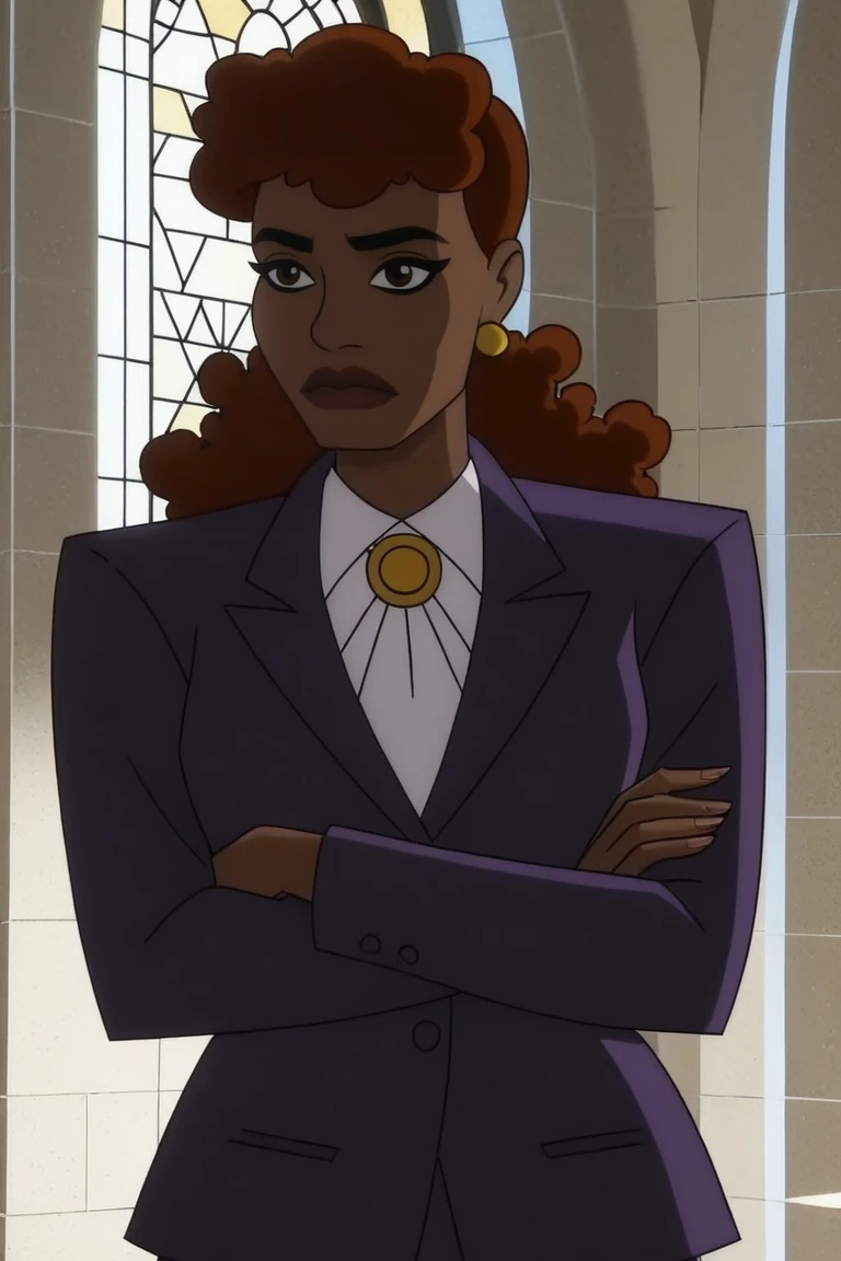 Barbara Gordon: Babs_Gordon, 1girl, female, dark skin, dark-skinned female, red hair, , shirt, jewelry, jacket, white shirt, earrings, formal suit