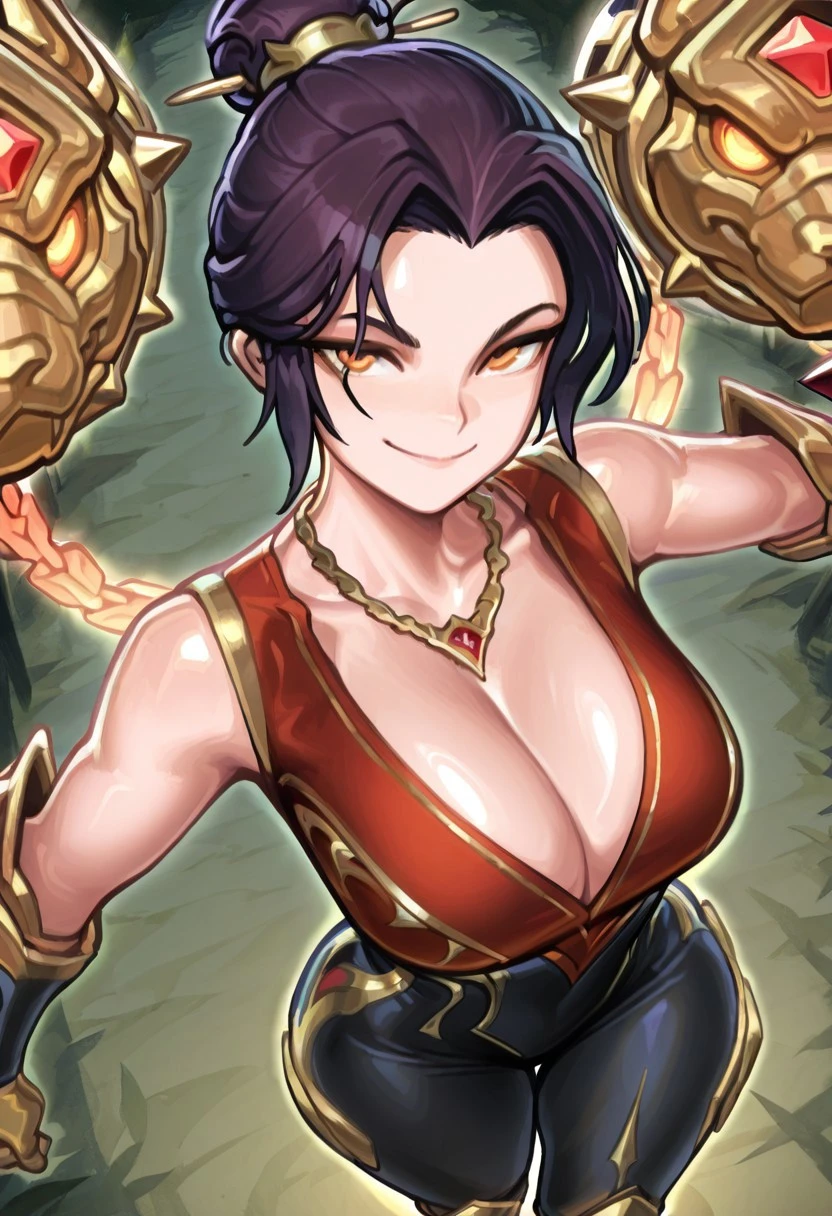 1girl, risenlegendkaisa, dark purple hair, single hair bun, hair stick, orange eyes, parted bangs, asymmetrical hair, facial mark, whisker markings,