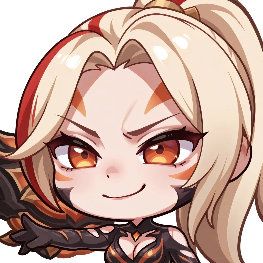 Tier 2 : 1girl, immortalizedkaisa, immortalizedkaisa_tier2, blonde hair, long ponytail, orange eyes, parted bangs, asymmetrical hair, facial mark, whisker markings, no pupils, bodysuit, symbiote, sharp fingernails, claw gloves, covered cleavage, glowing cleavage,