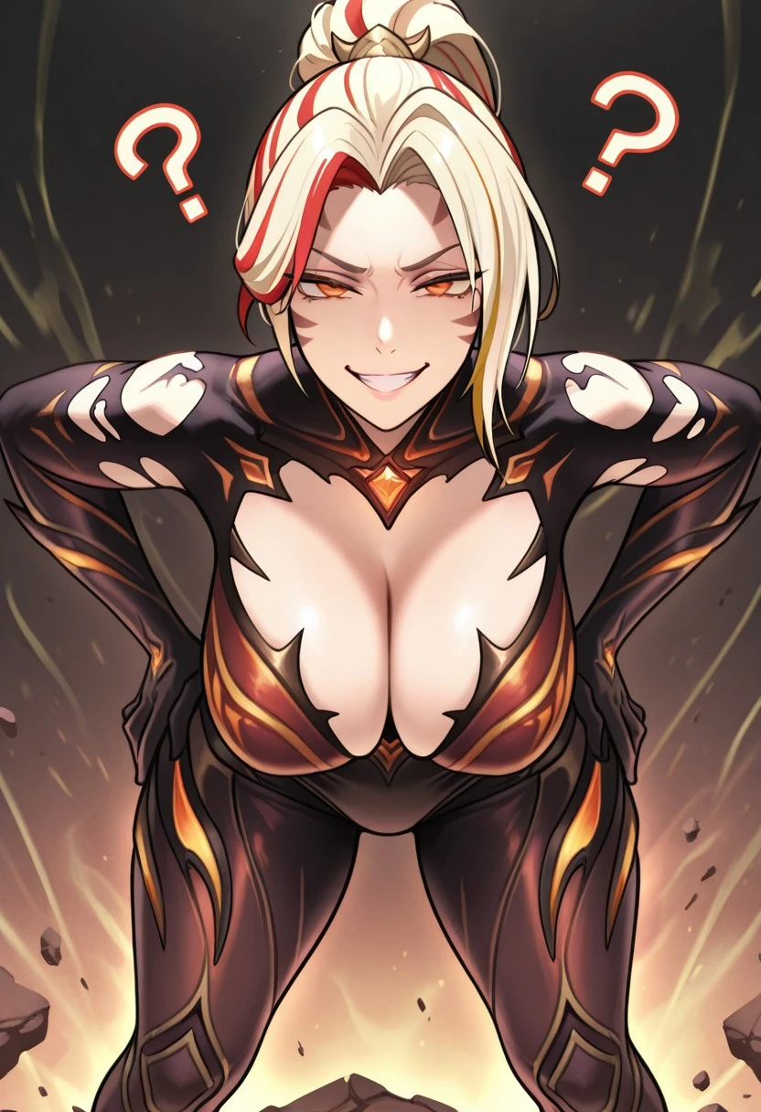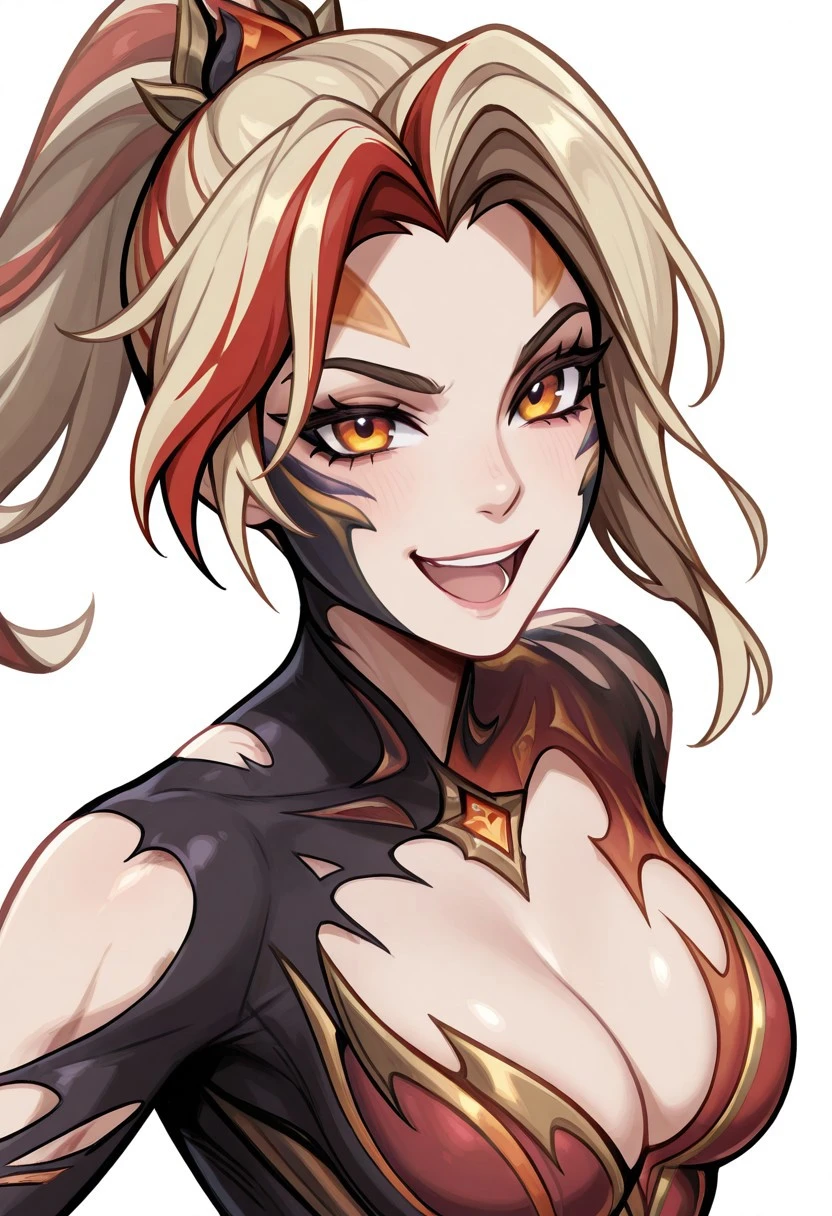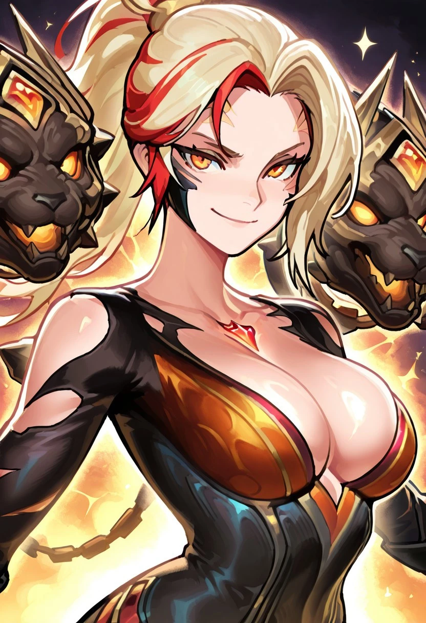 Tier I : 1girl, immortalizedkaisa, immortalizedkaisa_tier1, blonde hair, long ponytail, multicolored hair, two-tone hair, streaked hair, red streaked hair, orange eyes, parted bangs, asymmetrical hair, facial mark, whisker markings, chest jewel, cleavage, symbiote, torn bodysuit, torn shoulder clothes,