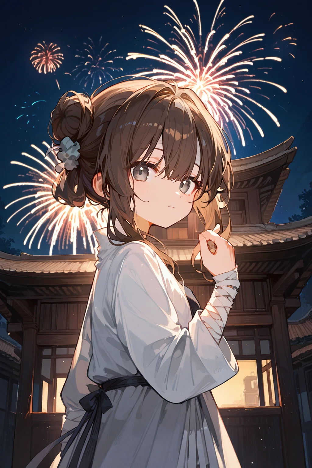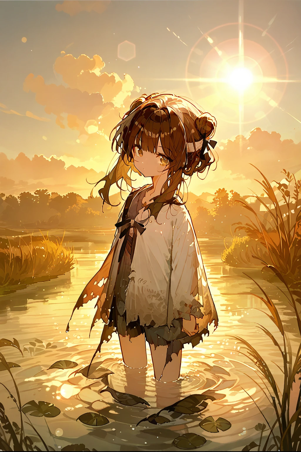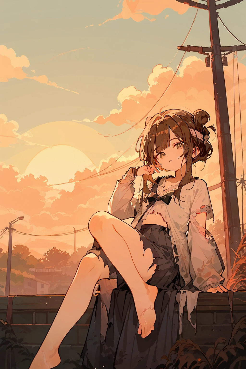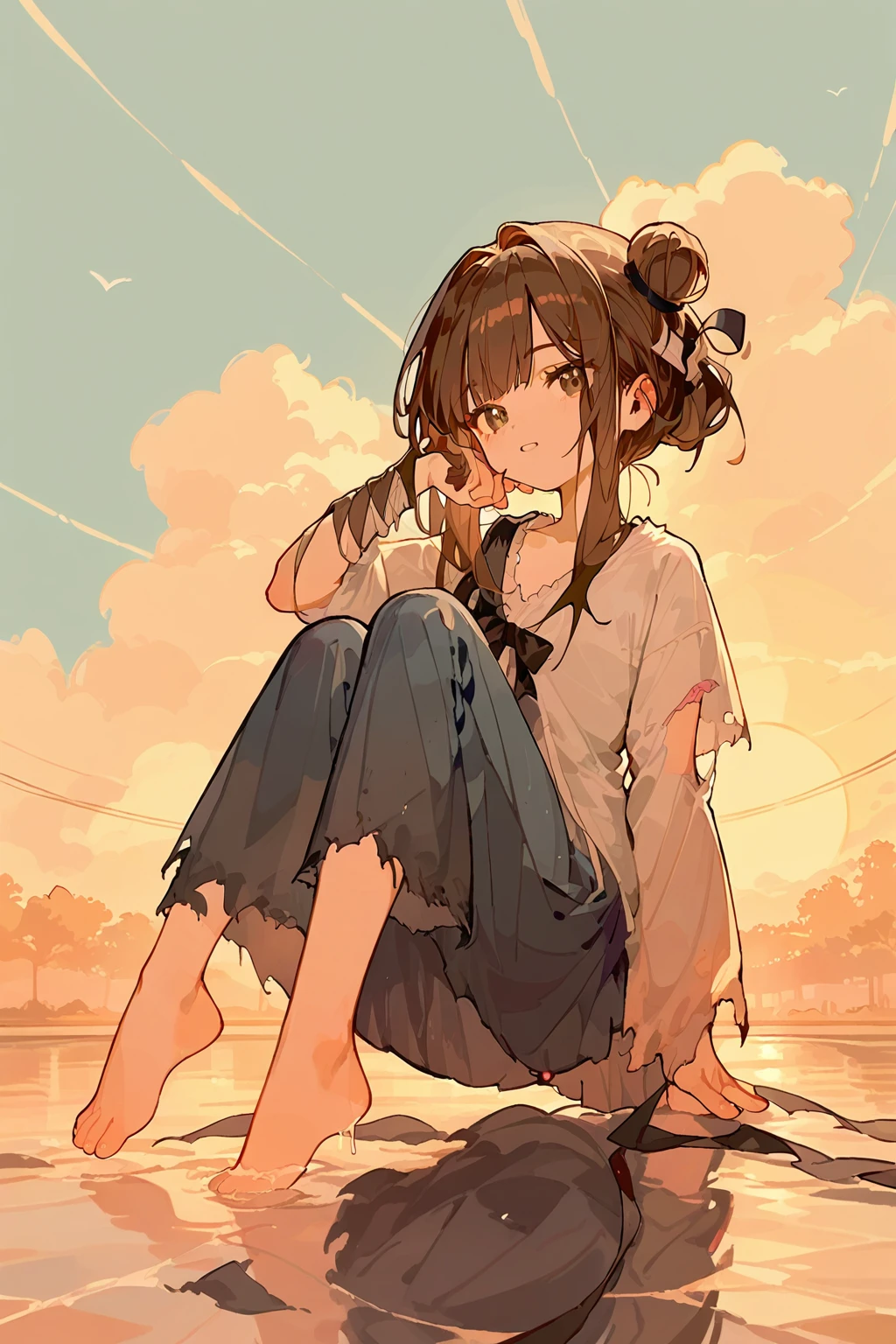 mansui,1girl,solo,brown hair,torn clothes,shirt,hair bun,bangs,long hair,ribbon,