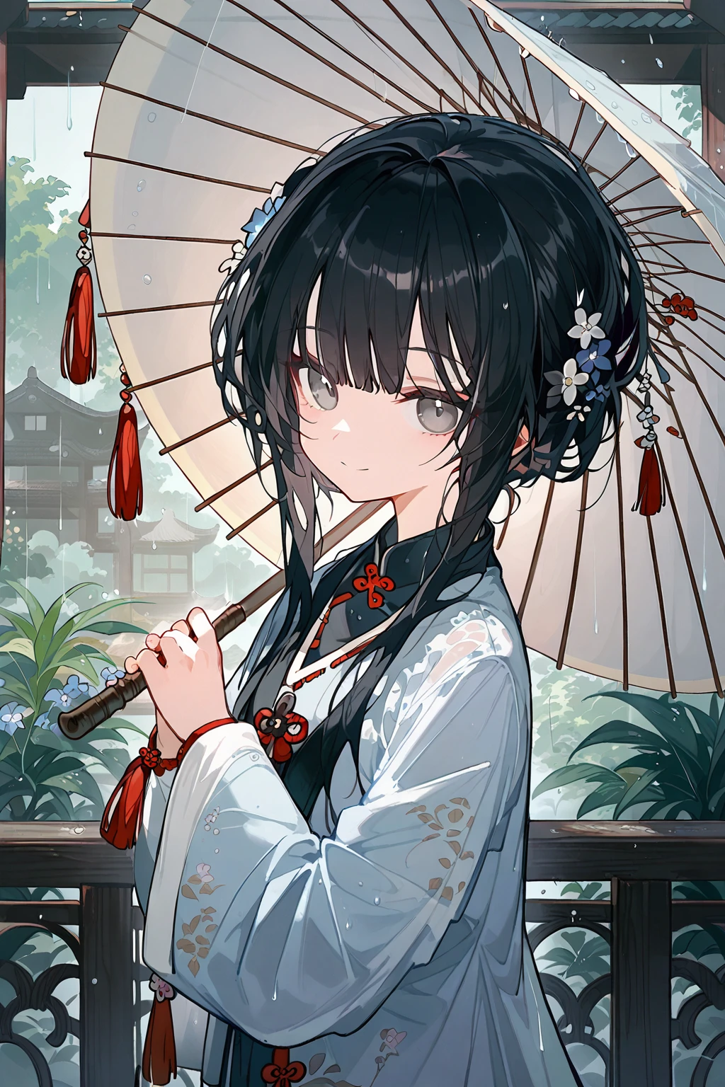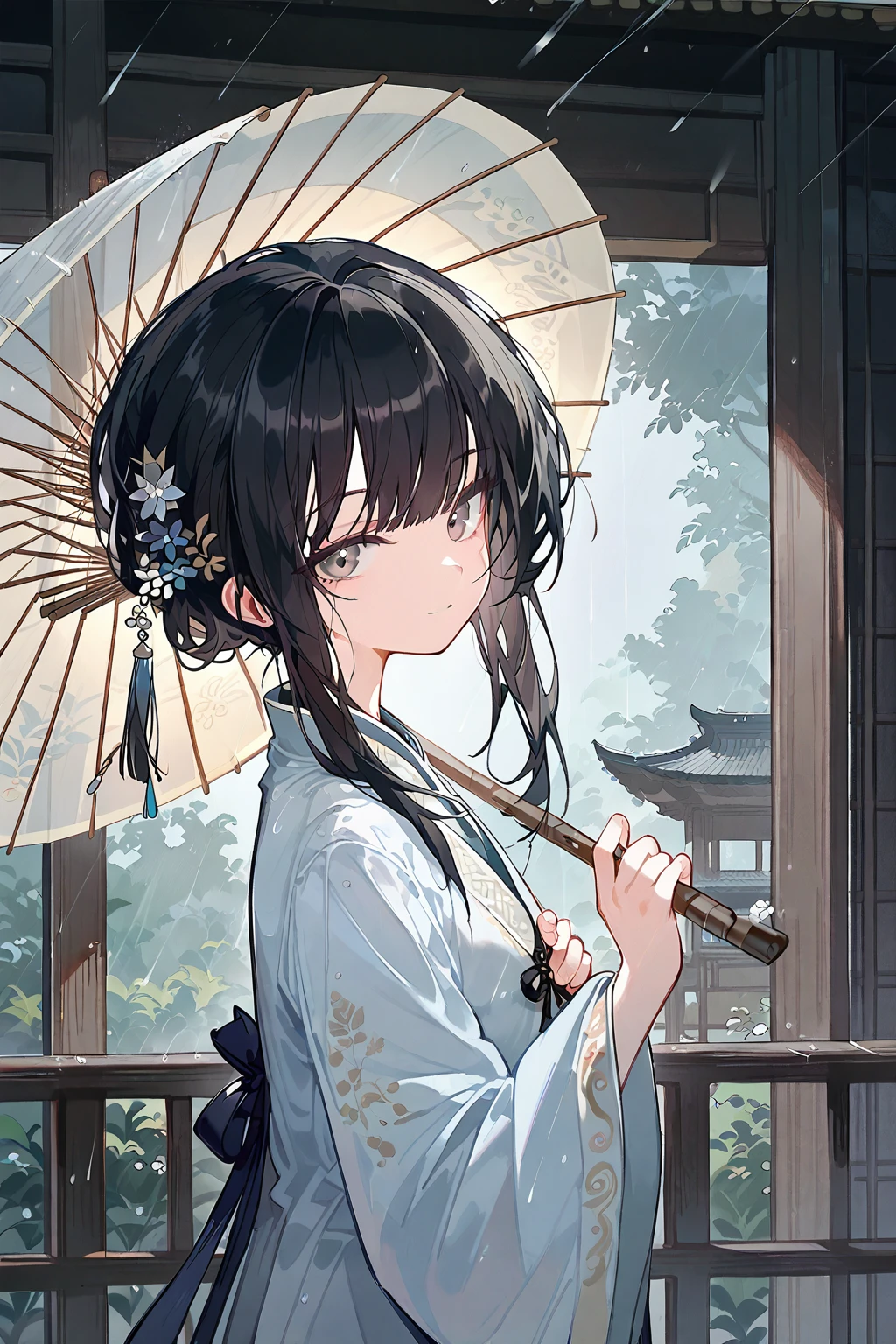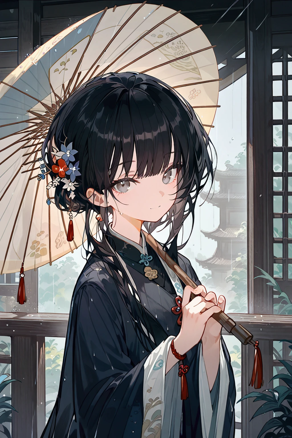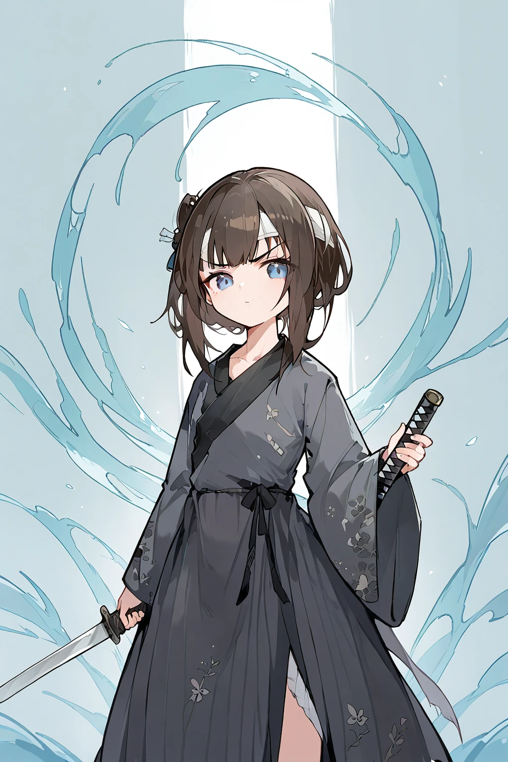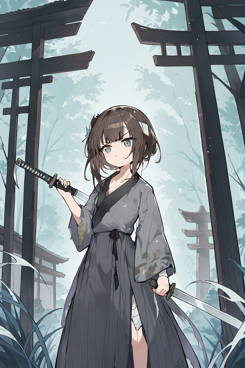 mansui,1girl,solo,brown hair,torn clothes,shirt,hair bun,bangs,long hair,ribbon,