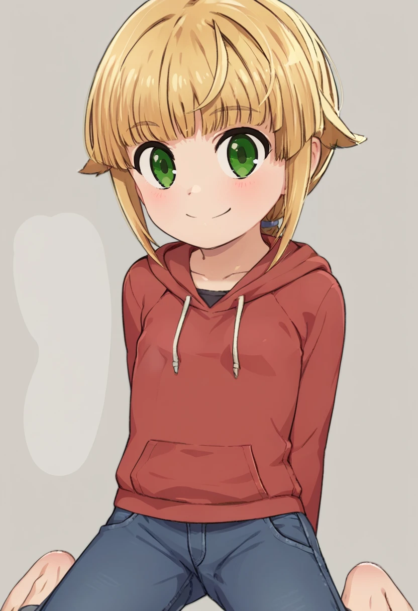(norn), blonde hair, short hair, low ponytail, green eyes, white bikini, smile, blush, closed mouth, kneeling, hands behind back,