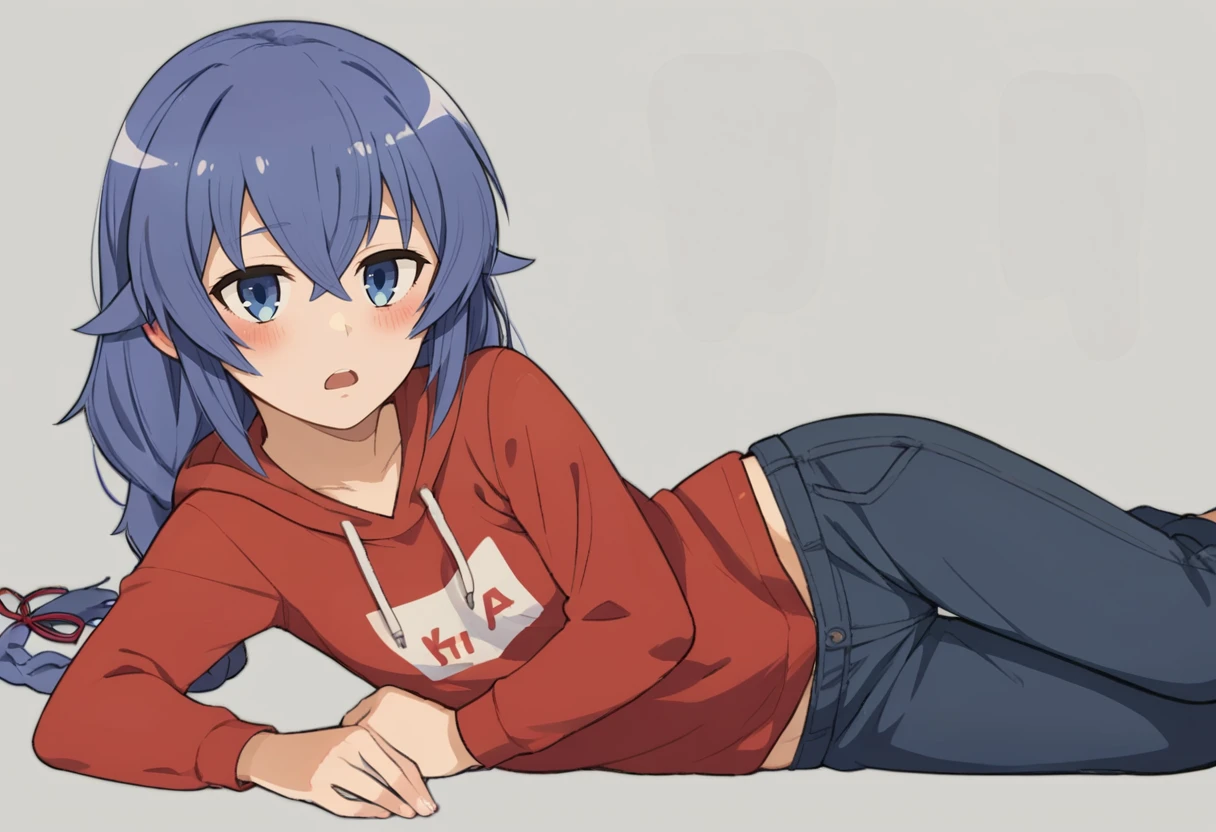 (roxy), blue hair, twin braids, long hair, blue eyes, black bikini, blush, open mouth, lying, on side,
