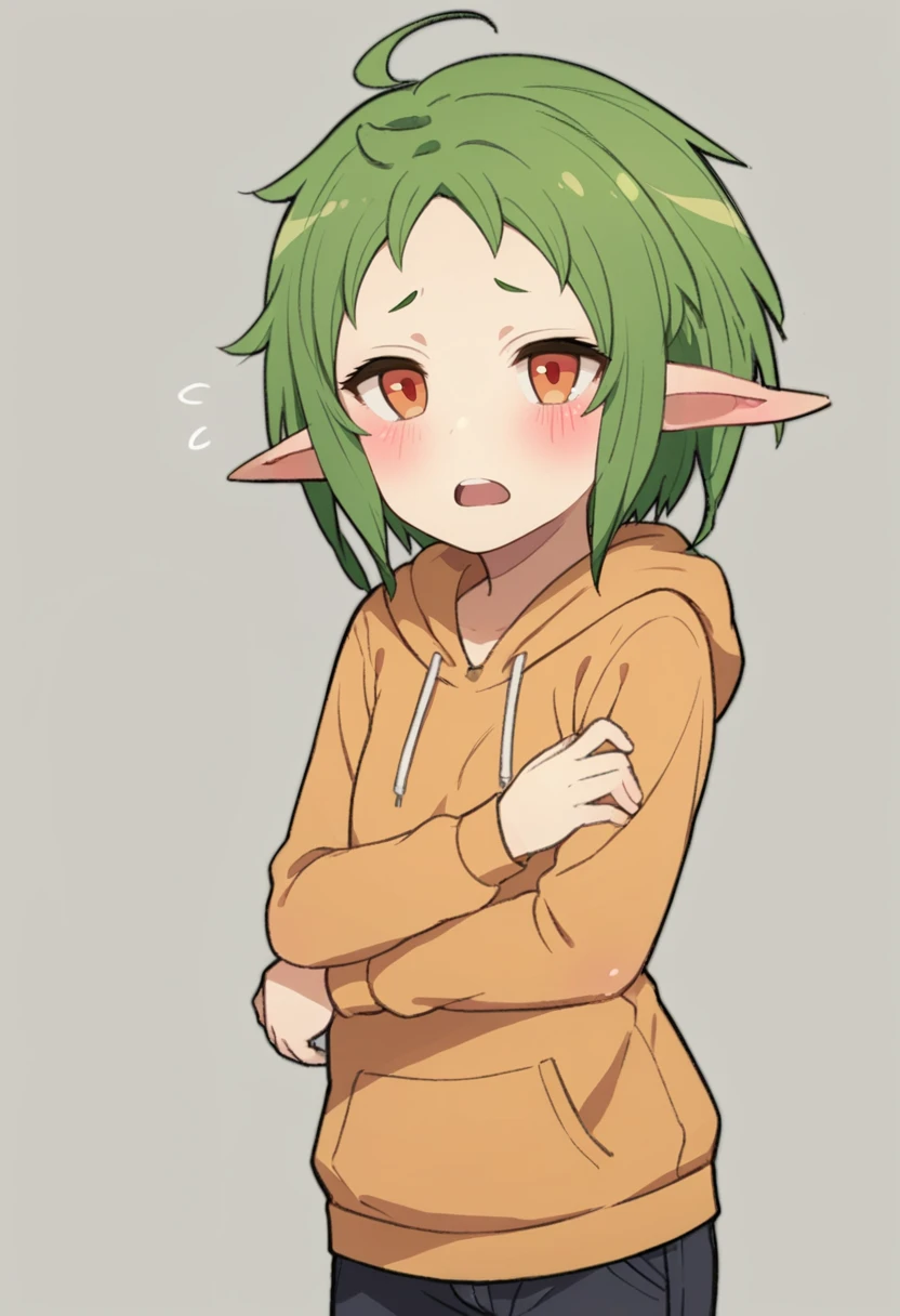 (sylphy), green hair, medium hair, parted bangs, pointy ears, orange eyes, white bikini, blush, open mouth, embarrassed pose,