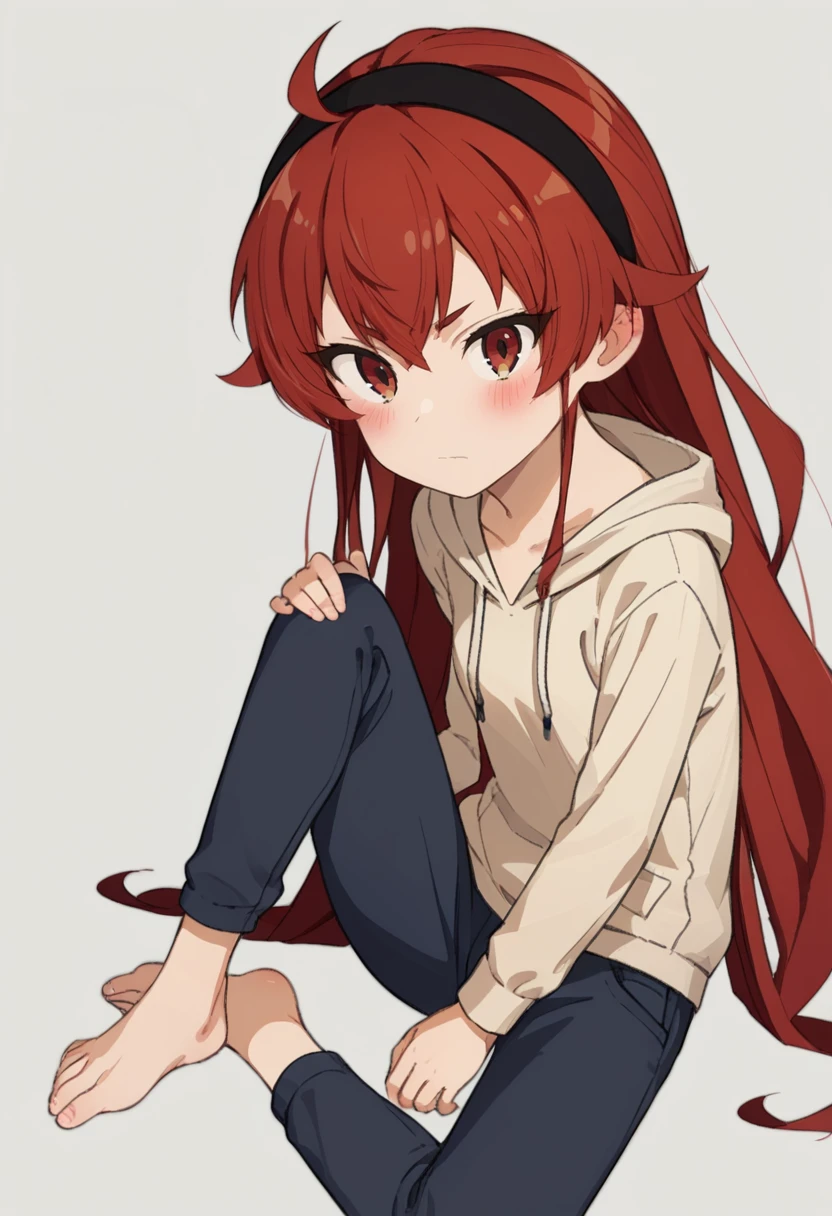 (eris), red hair, long hair, hairband, red eyes, black bikini, blush, closed mouth, sitting, one knee up,