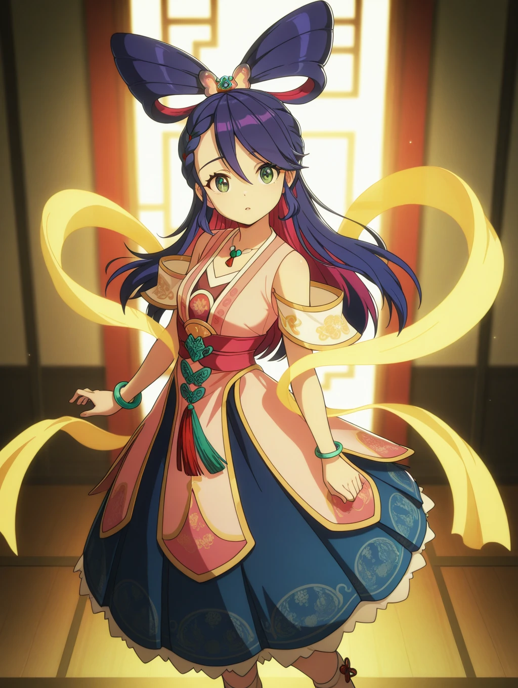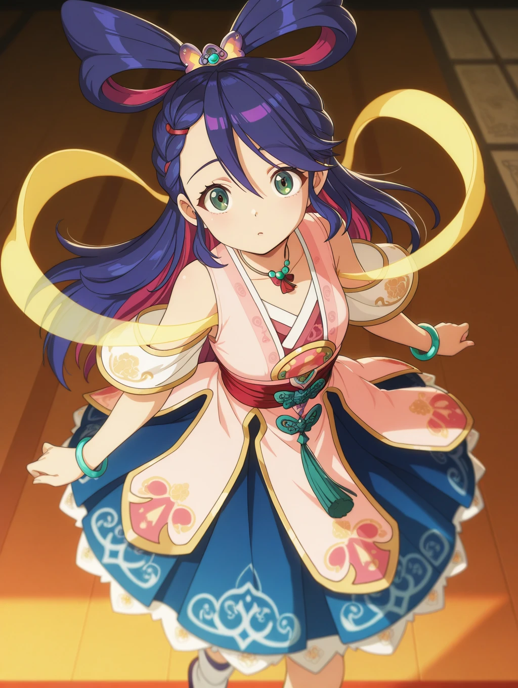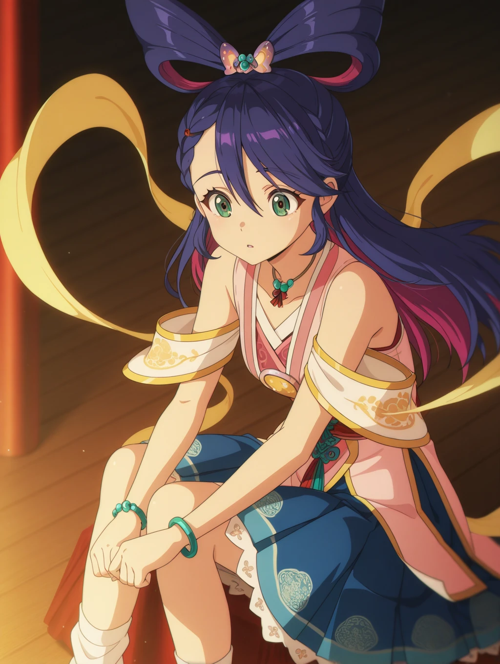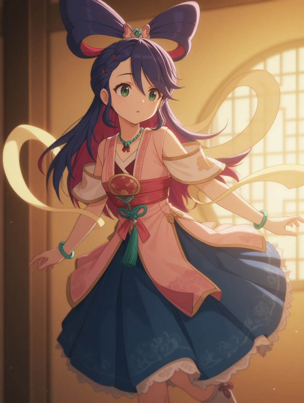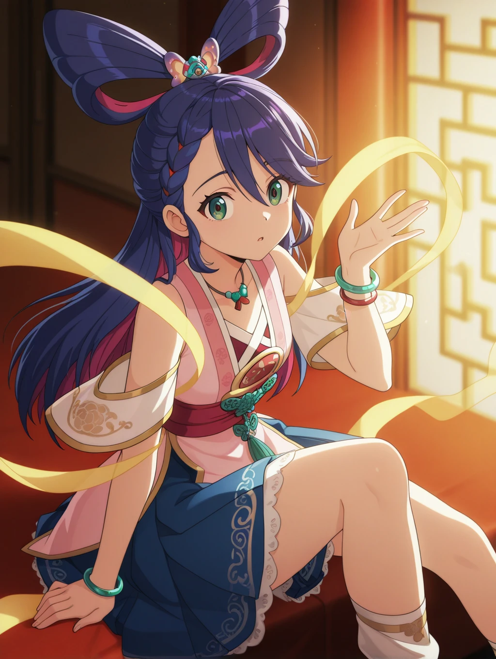 dabin, 1girl, solo, long hair, hair ornament, pink dress, blue skirt, jewelry, green eyes, blue hair, purple hair, red-inner hair, socks, bracelet, chinese clothes, hair rings, hagoromo, white gaiter,