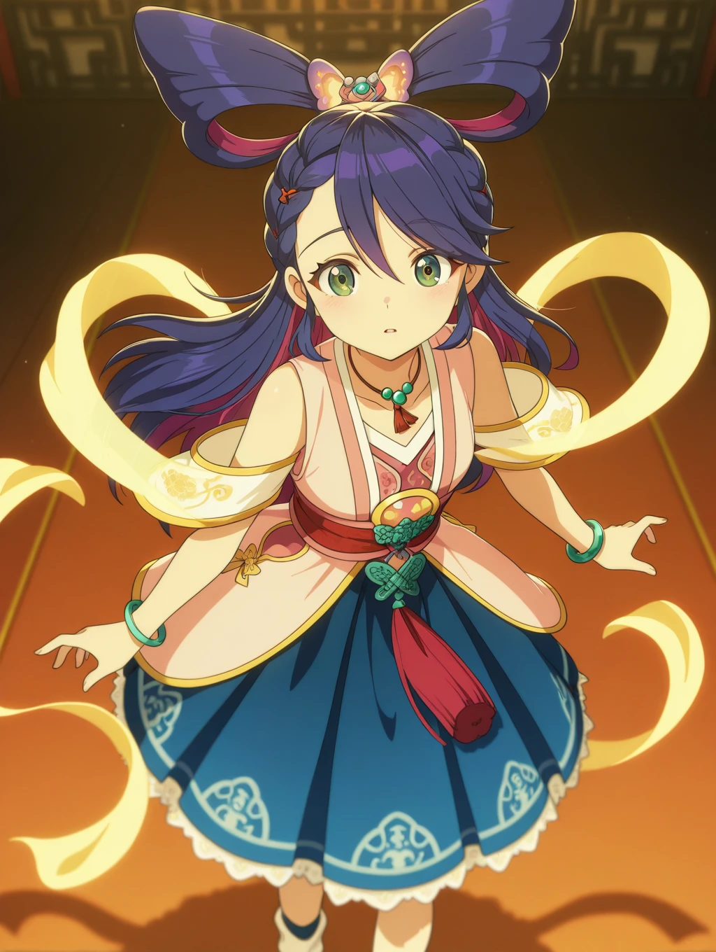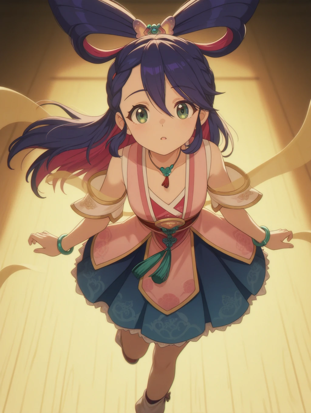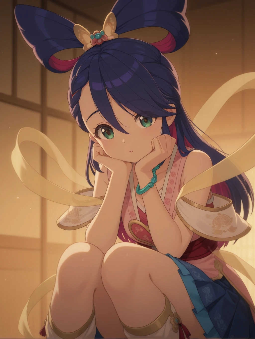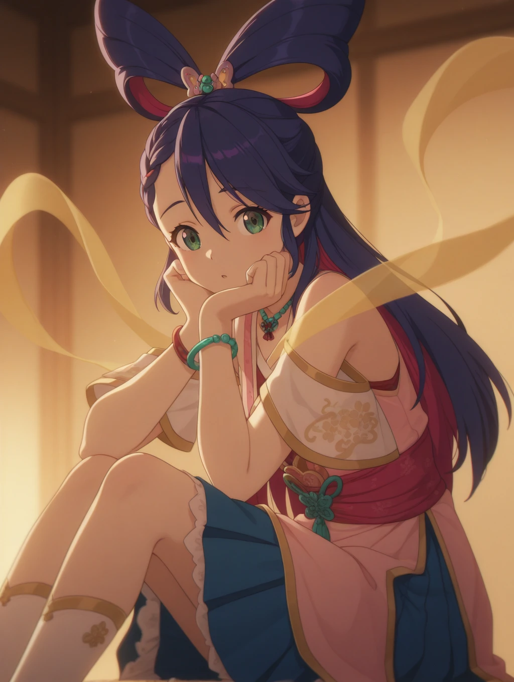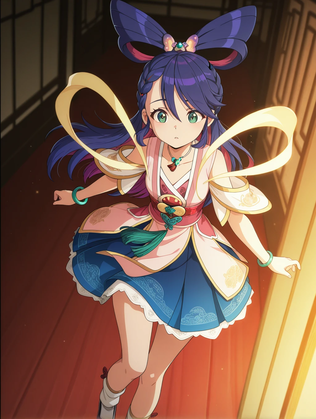 dabin, 1girl, solo, long hair, hair ornament, pink dress, blue skirt, jewelry, green eyes, blue hair, purple hair, red-inner hair, socks, bracelet, chinese clothes, hair rings, hagoromo, white gaiter,