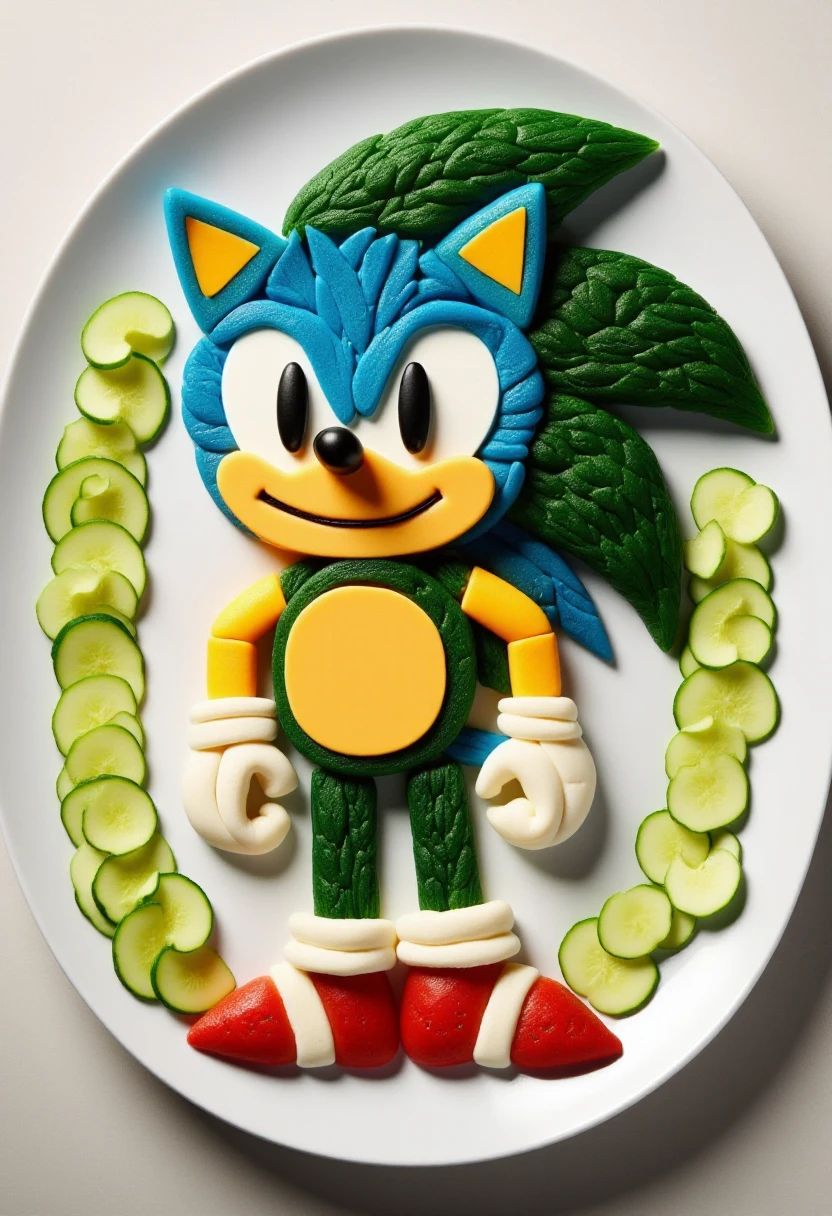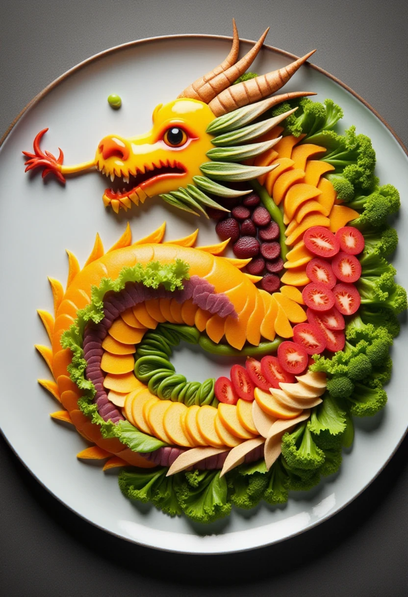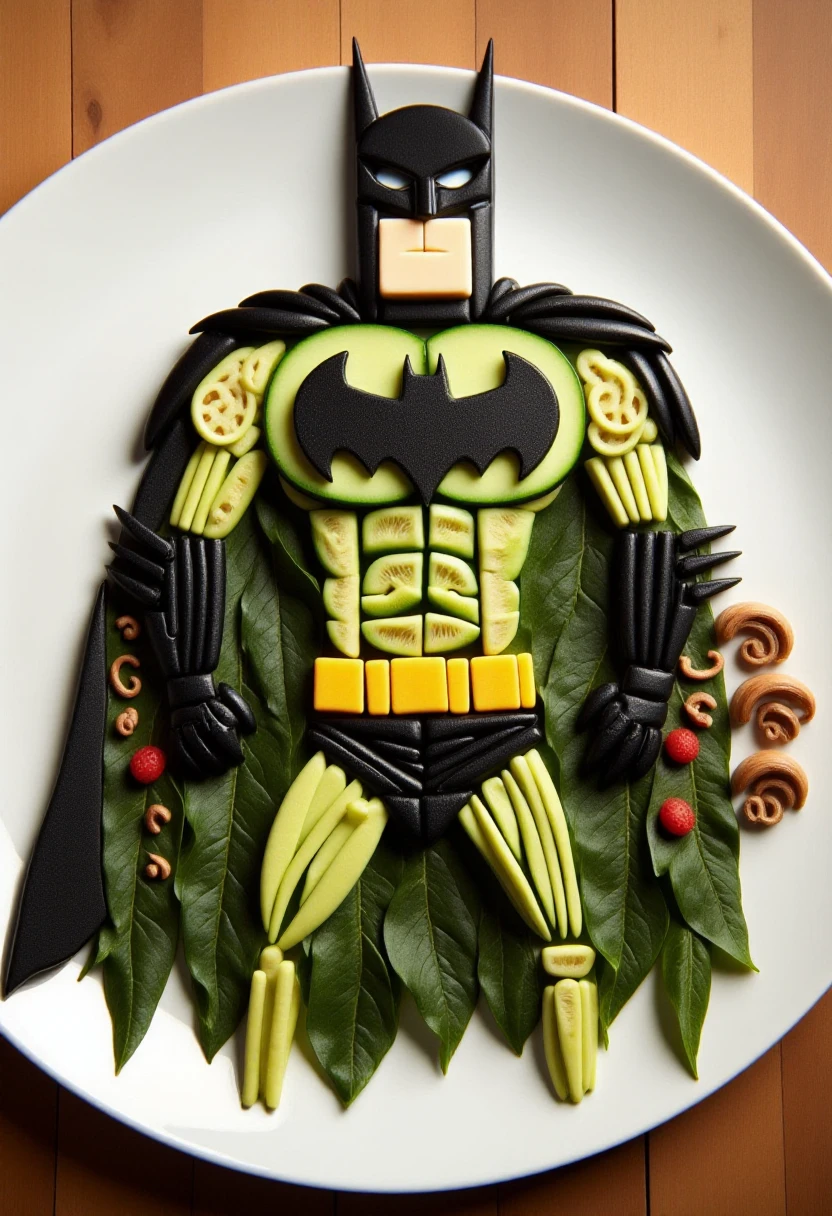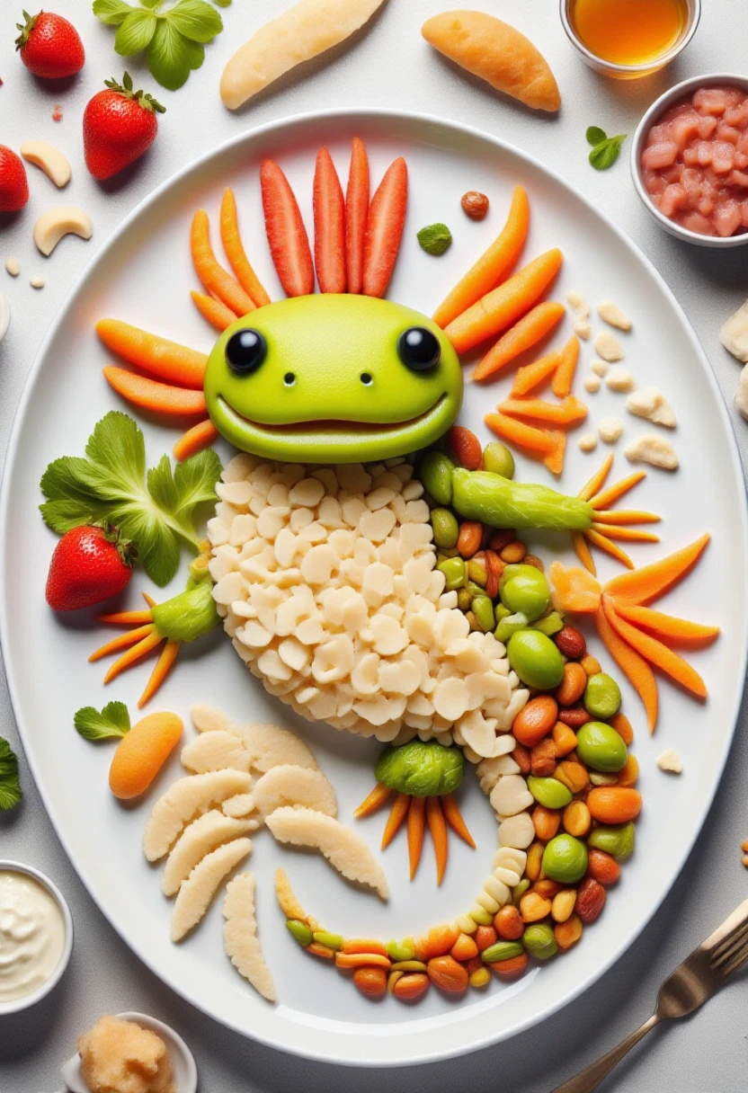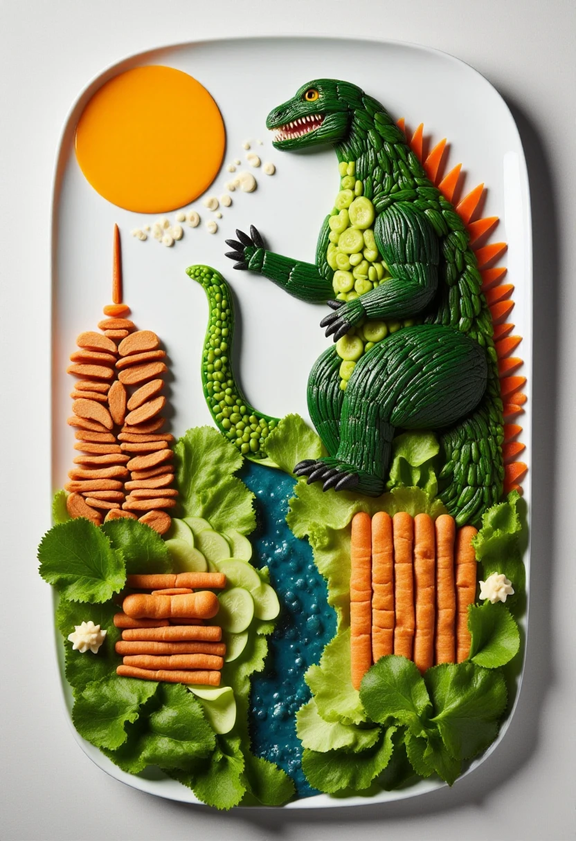 Photograph showcasing a meticulously arranged plate of food art, designed to resemble (SUBJECT).