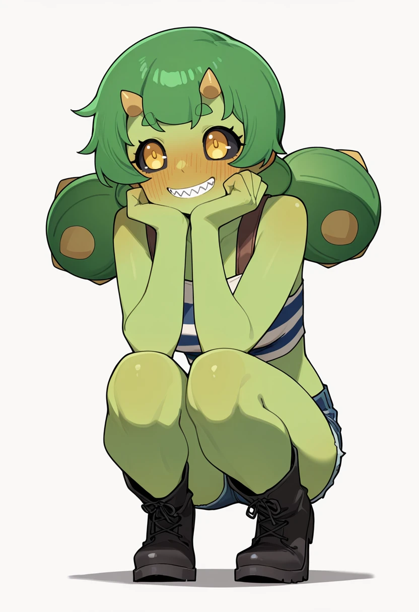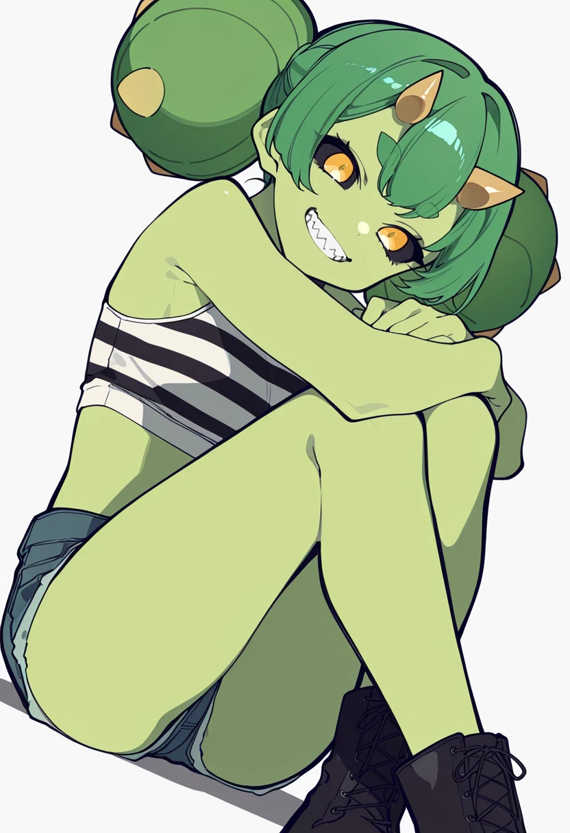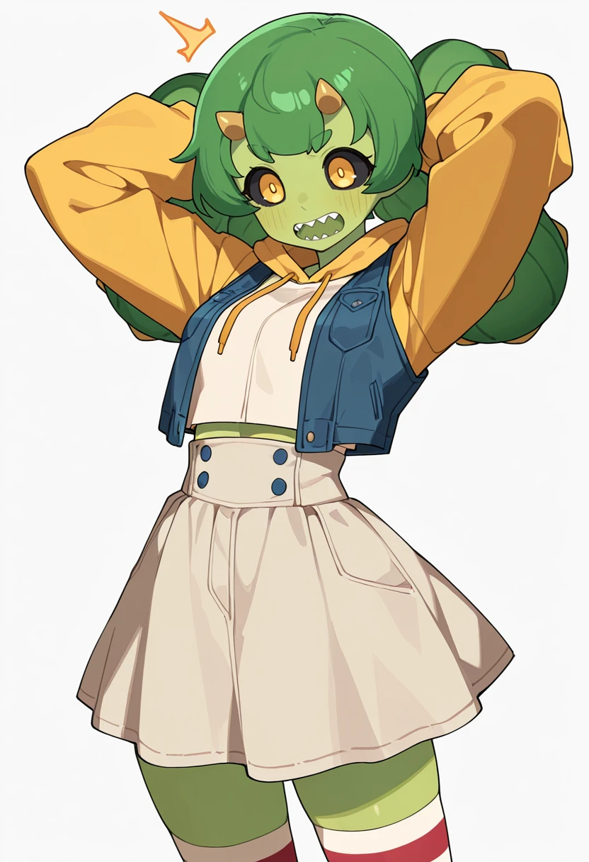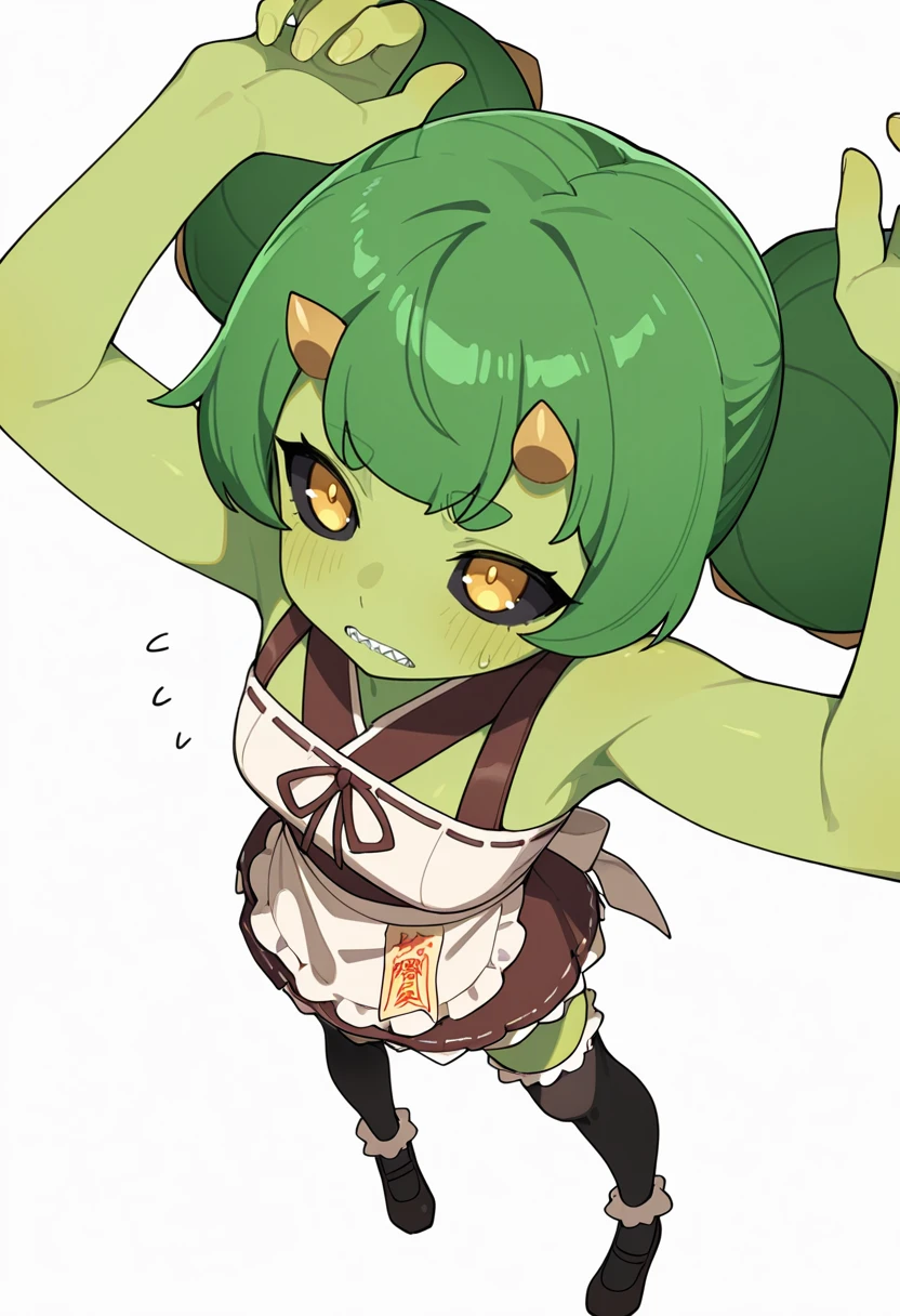 cactus_cnr, 1girl,monster girl, green skin, colored skin, long hair, twintails, bangs, yellow eyes, colored sclera, black sclera, sharp teeth,thick eyebrows, horns, hair ornament,