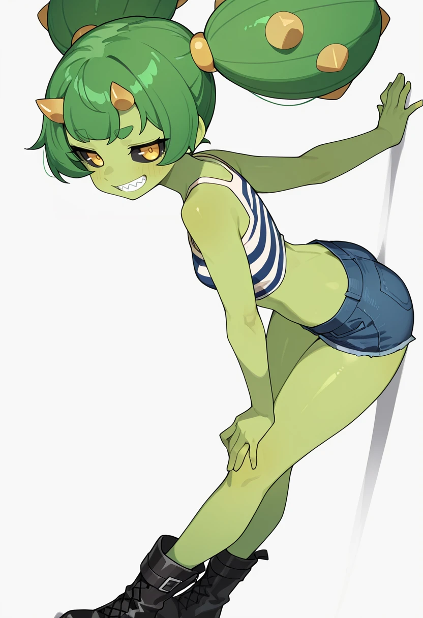 cactus_cnr, 1girl,monster girl,   green skin, colored skin, long hair, twintails, bangs, yellow eyes, colored sclera, black sclera, sharp teeth,thick eyebrows, horns, hair ornament,