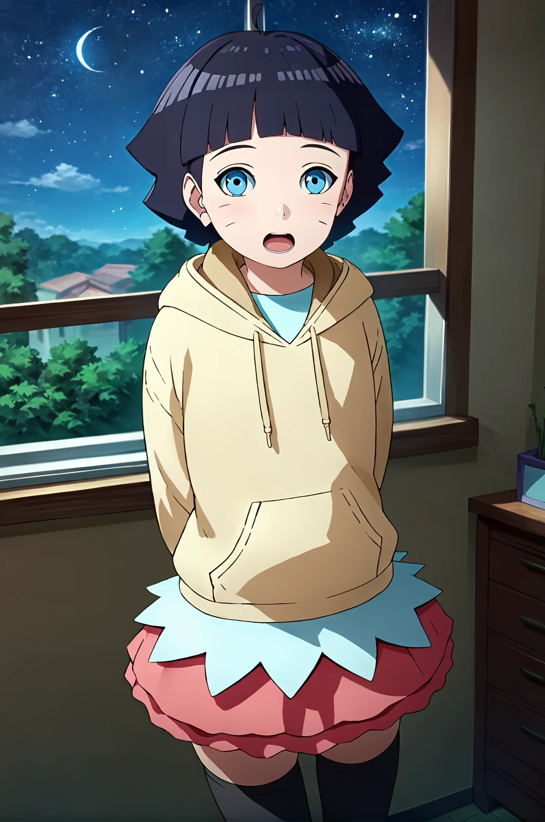 uzumaki_himawar1, hoodie, hima-skirt, black stockings, dark pink sandals