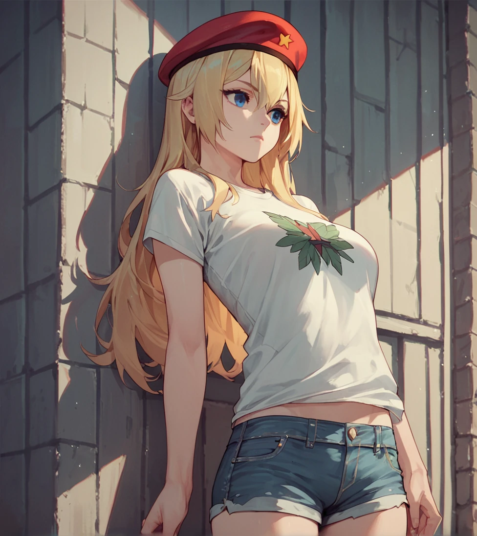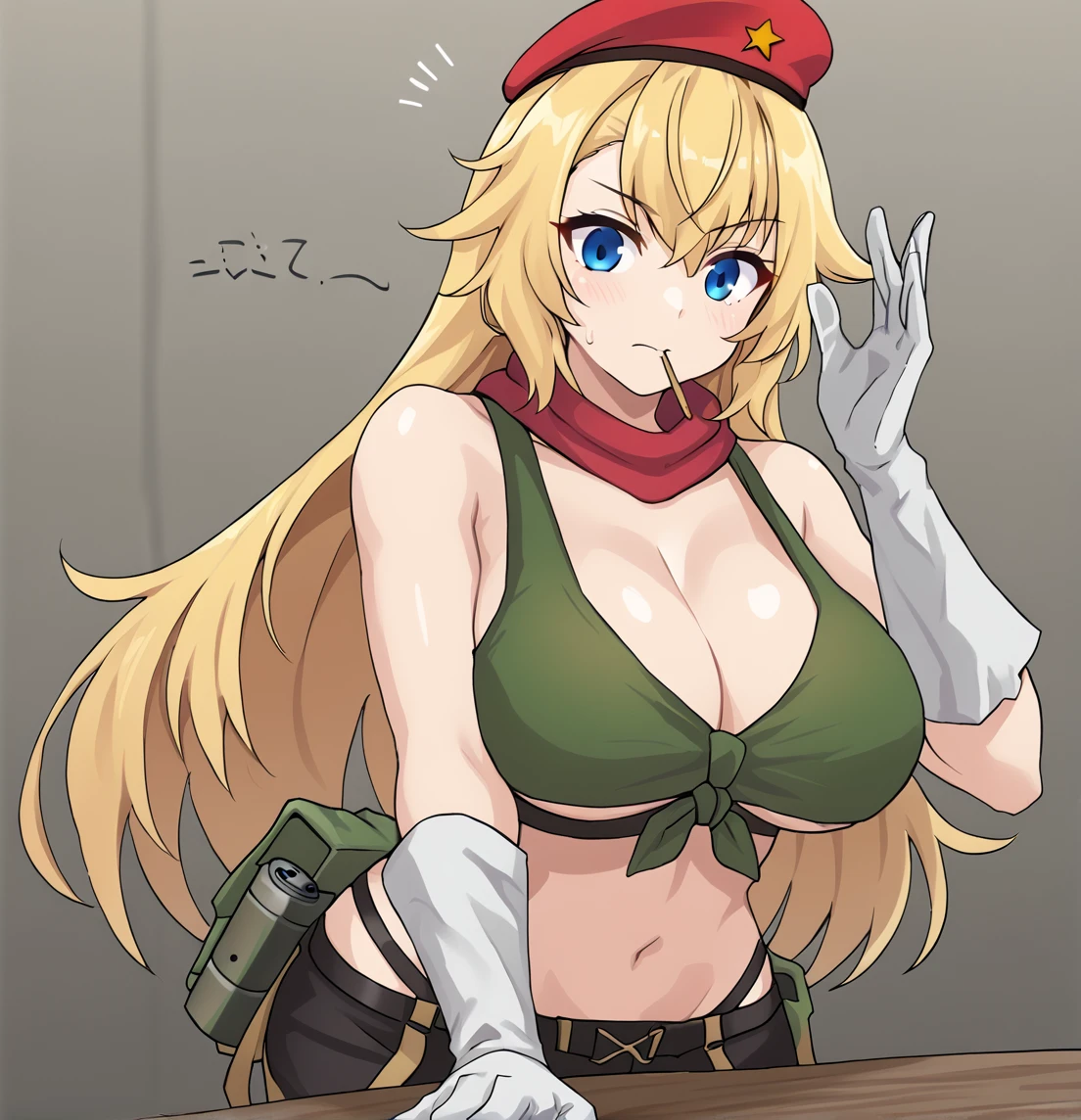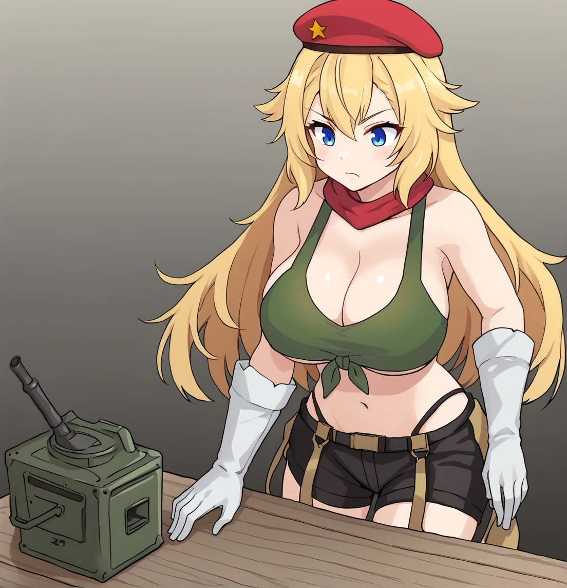 beret, blonde hair, long hair, blue eyes, gloves, green crop top, large breasts, cleavage, black shorts, white gloves,
