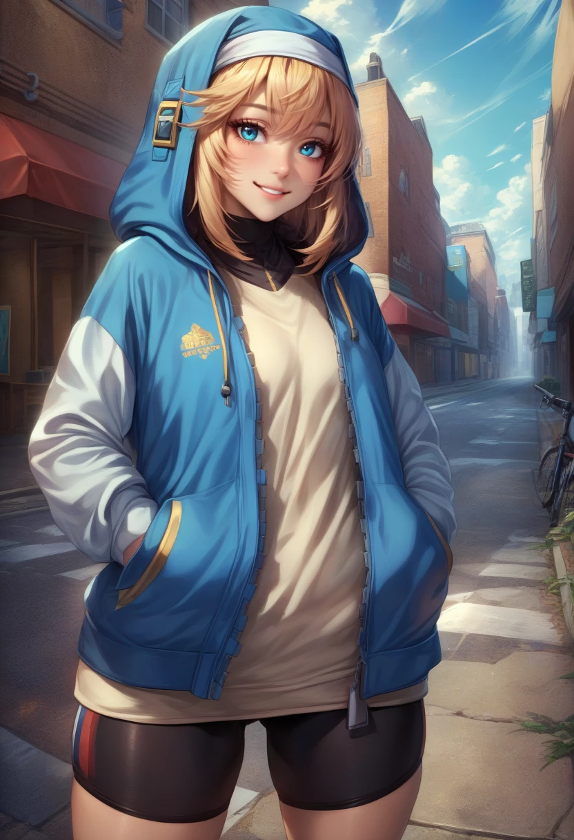 hooded jacket, long sleeves, black gloves, fingerless gloves, skirt, bike shorts