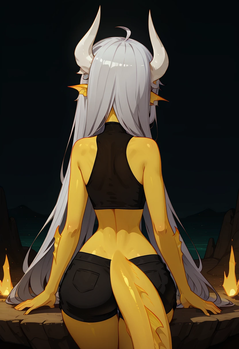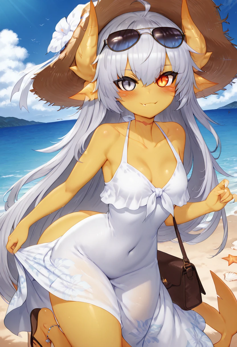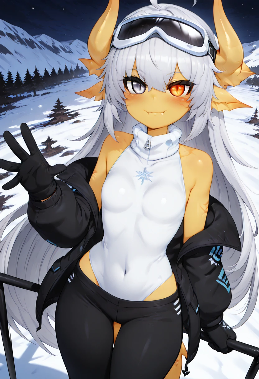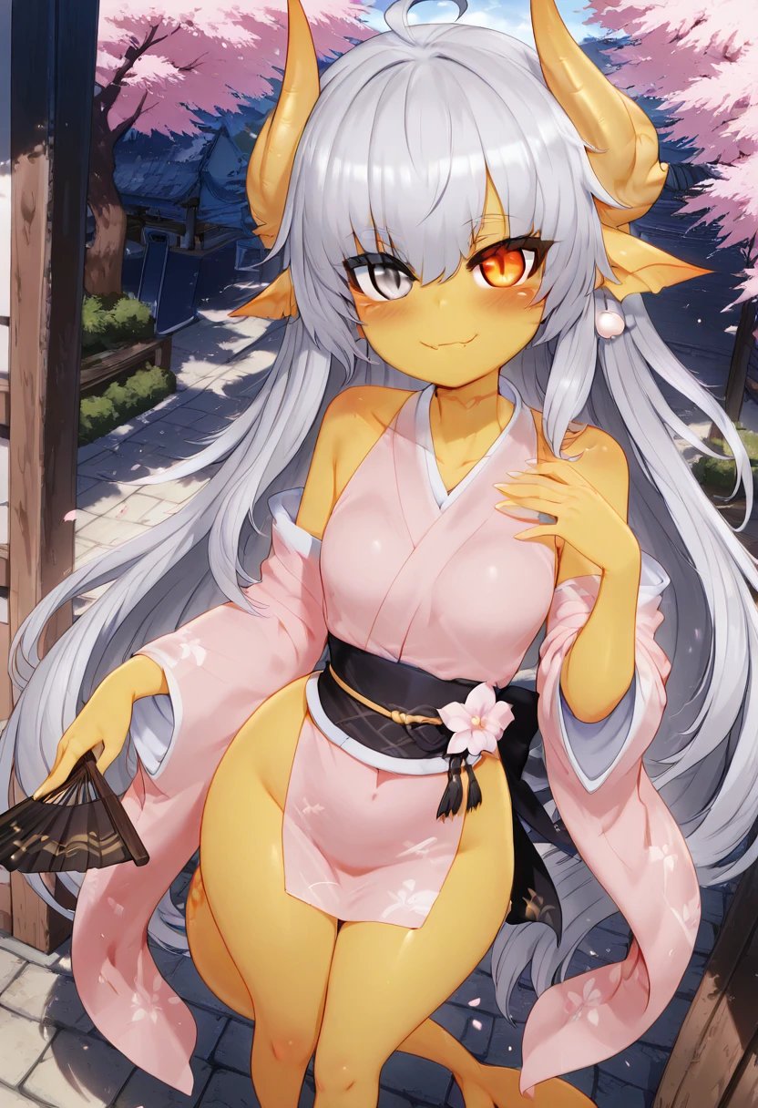 zzYT, heterochromia, grey eyes, orange eyes, long hair, white horns, ahoge, grey hair, head fins, very long hair, colored sclera, monster girl, colored skin,
