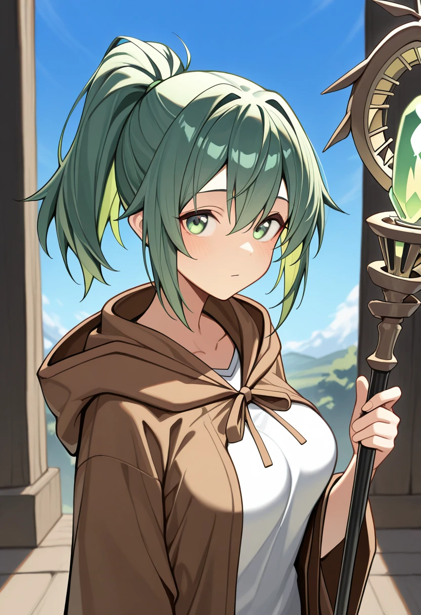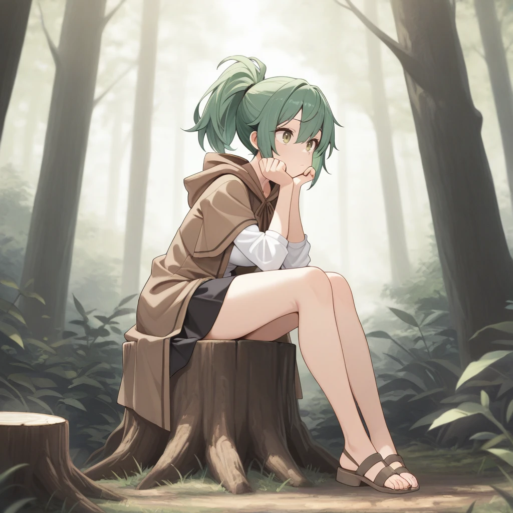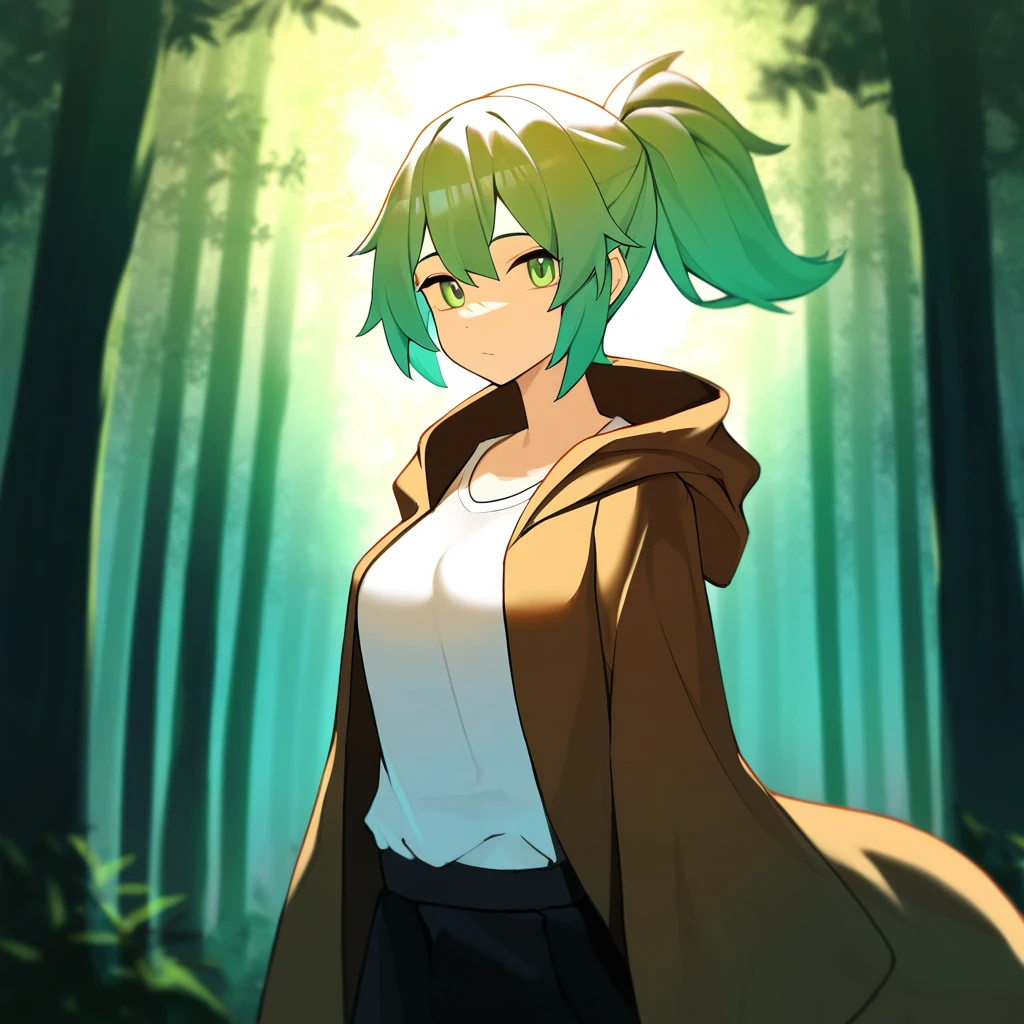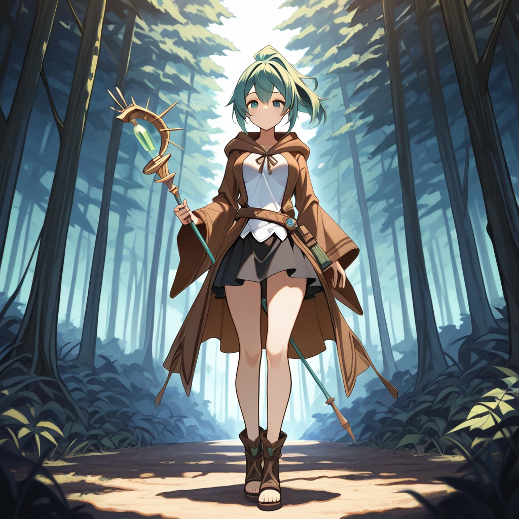 (brown hooded robe, hood down), white shirt, black skirt, boots