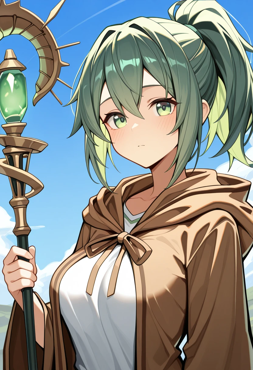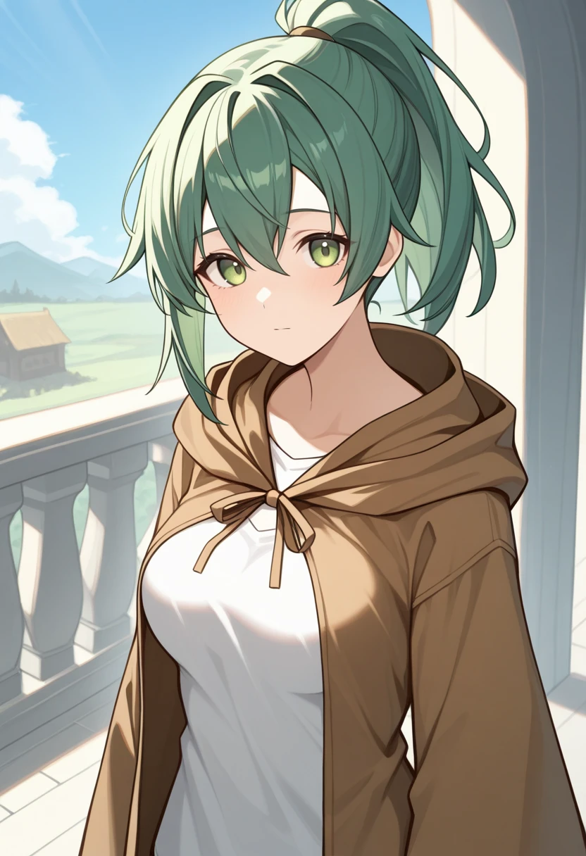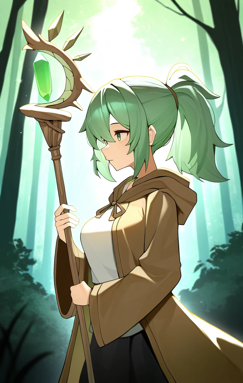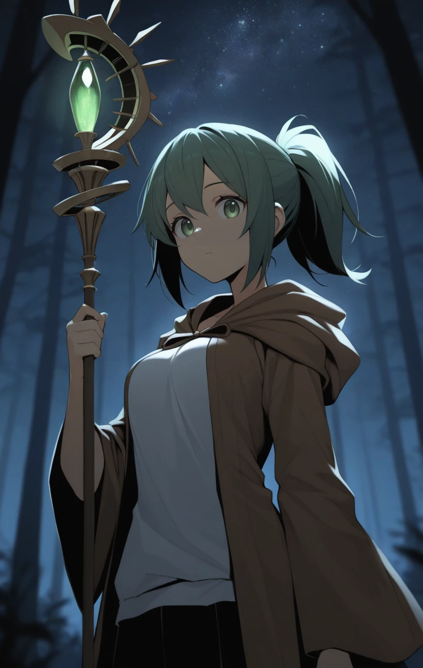 (brown hooded robe, hood down), white shirt, black skirt, boots