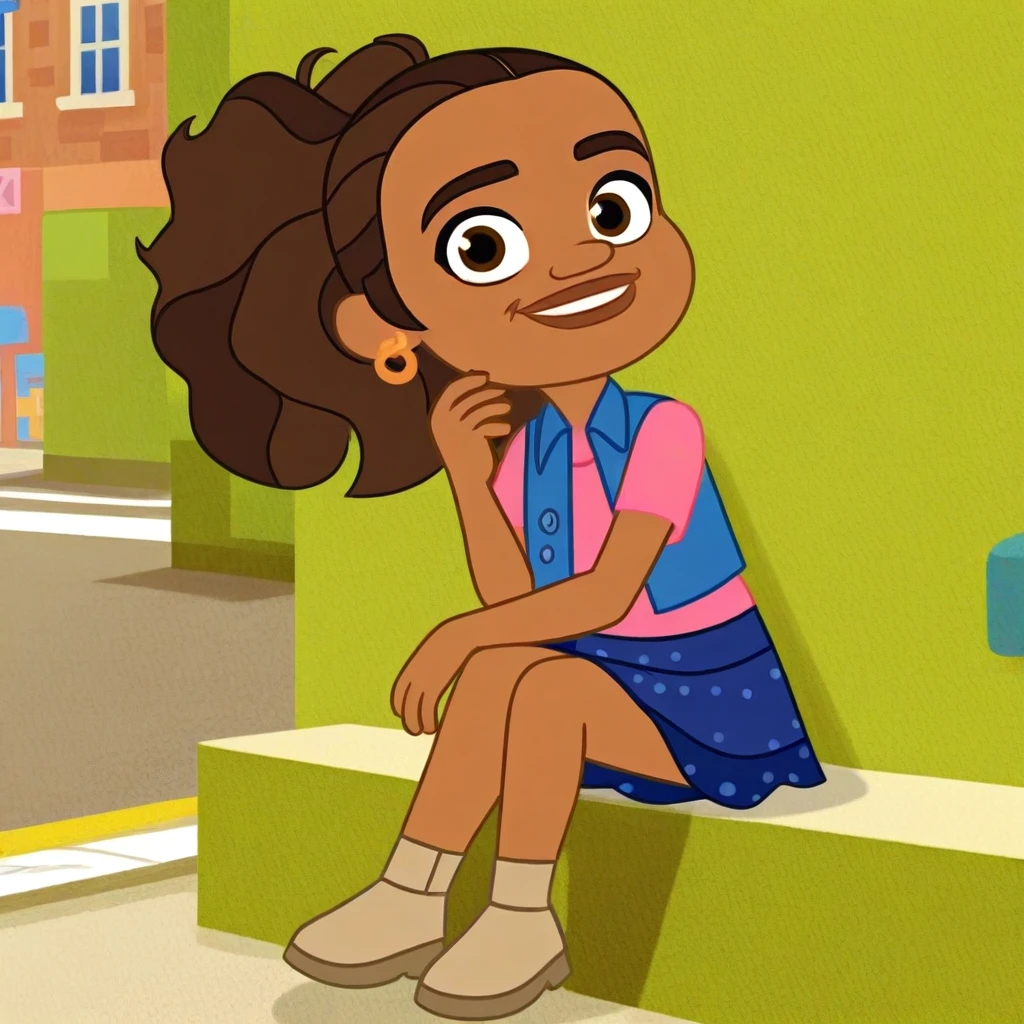 alma, brown hair, dark skin, earrings, vest, shirt, skirt