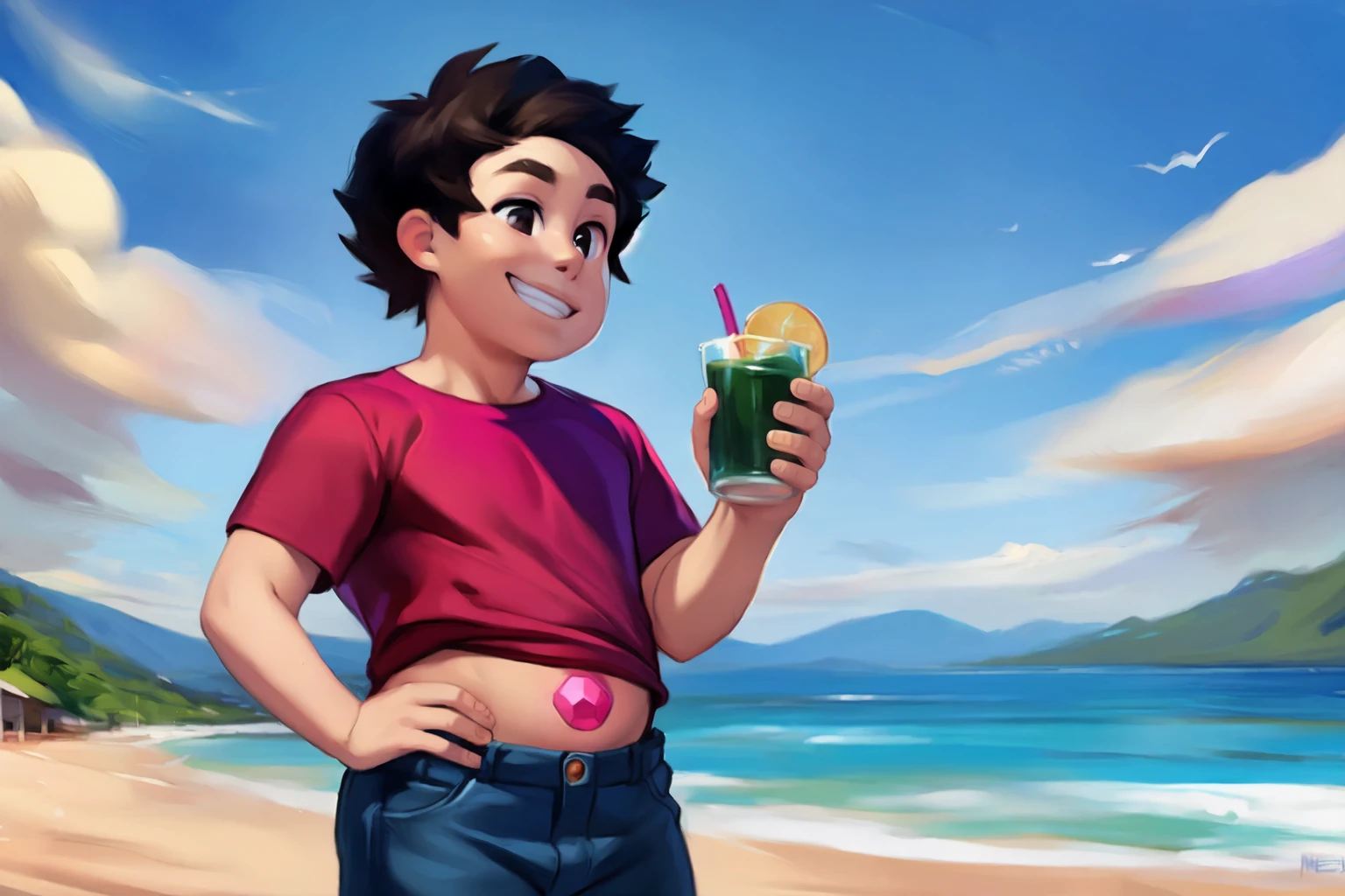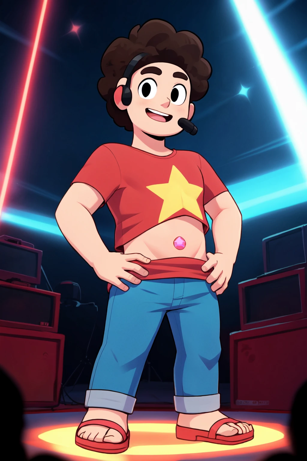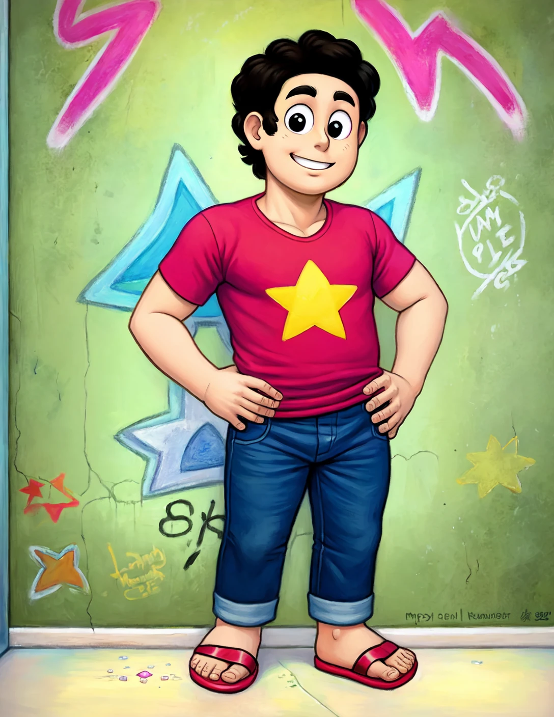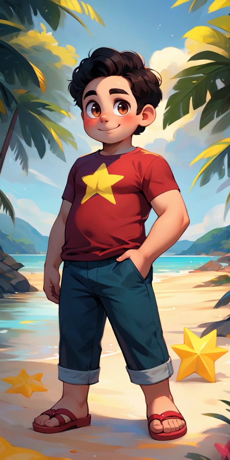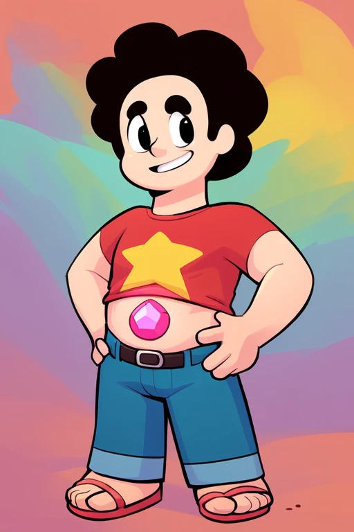 <lora:StevenQUniverseV1.1:0.7>,stevenquniverse, pink navel gem,black eyes, black curly hair,male, solo, detailed eyes,blue jeans,red tshirt star (symbol), red sandals,full body,happy,one hand on hip,looking at viewer,(Human:1.9),