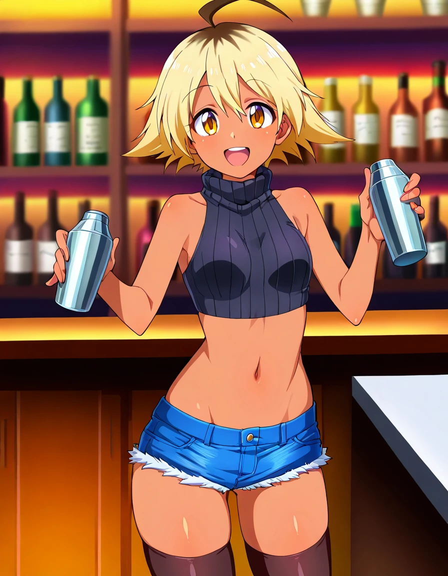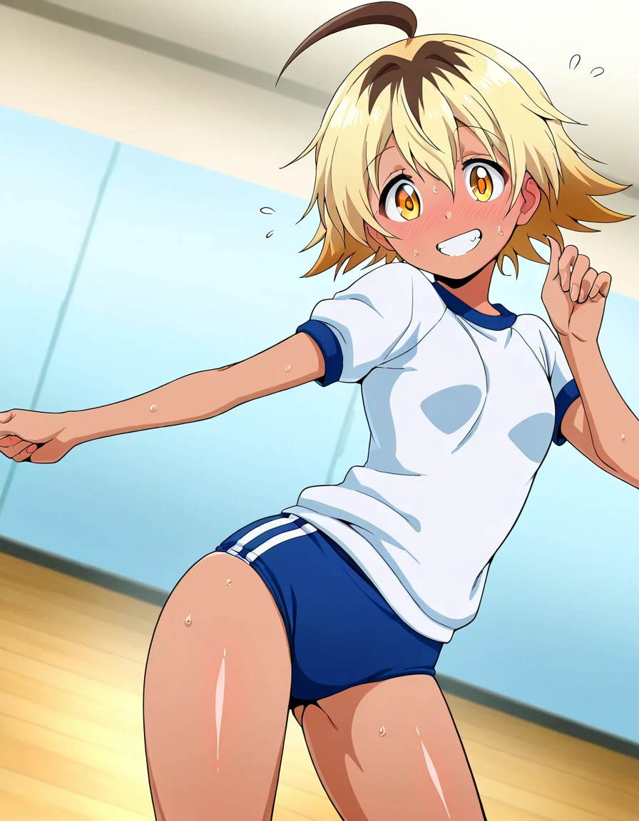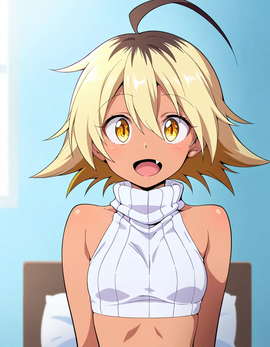 nyako, dark skin, dark-skinned female, yellow eyes, blonde hair, multicolored hair, short hair, ahoge, small breasts,