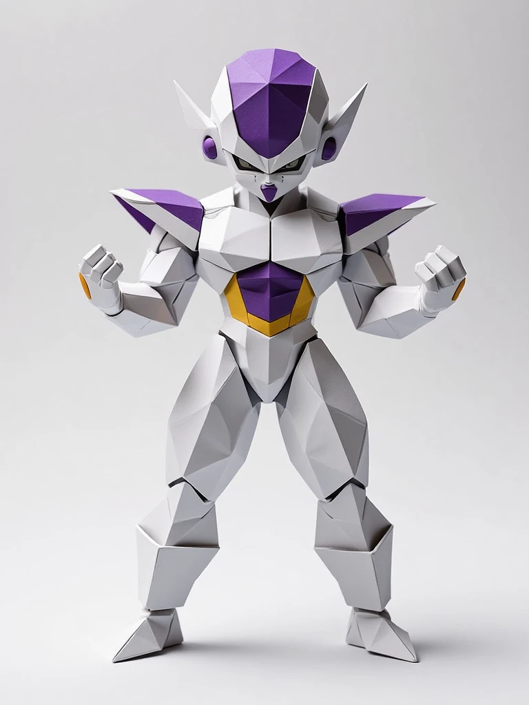 Origami - style character models of Frieza in final form, menacing posture, cold colors, angular creases.