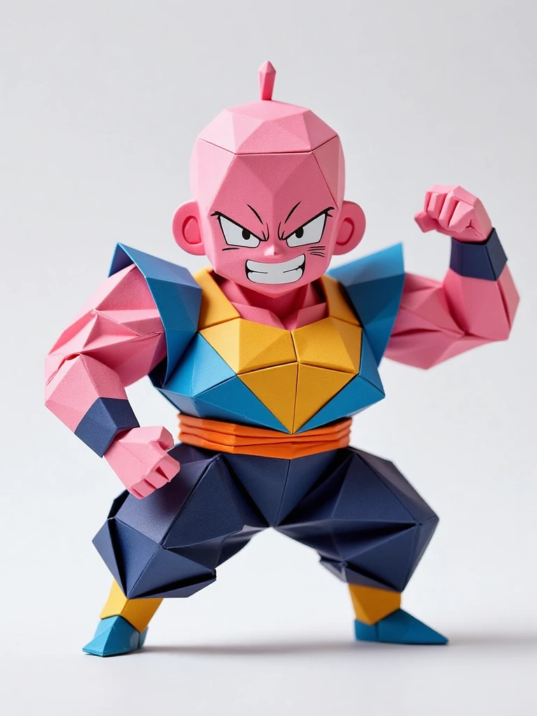 Origami - style character models of Majin Buu, chubby figure, pastel colors, smooth origami folds.