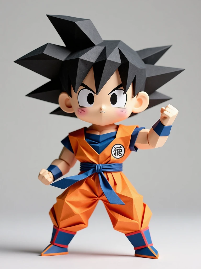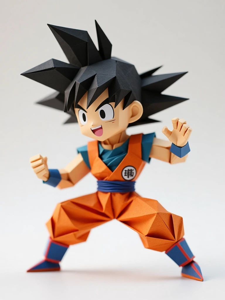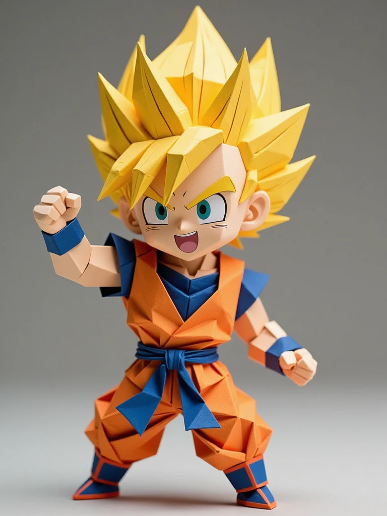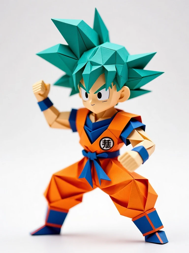 Origami - style character models of Goku in Super Saiyan Blue, dynamic pose, bright colors, sharp folds.