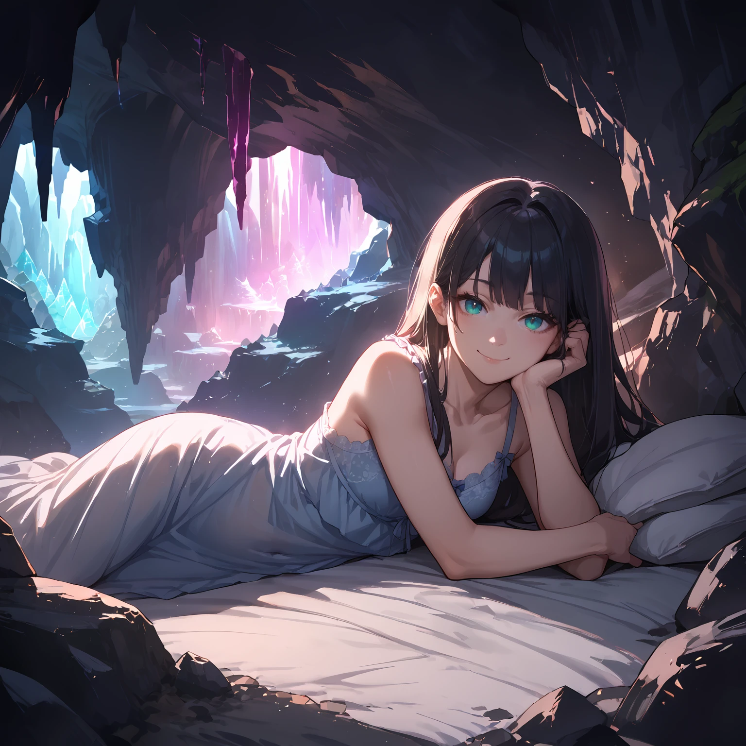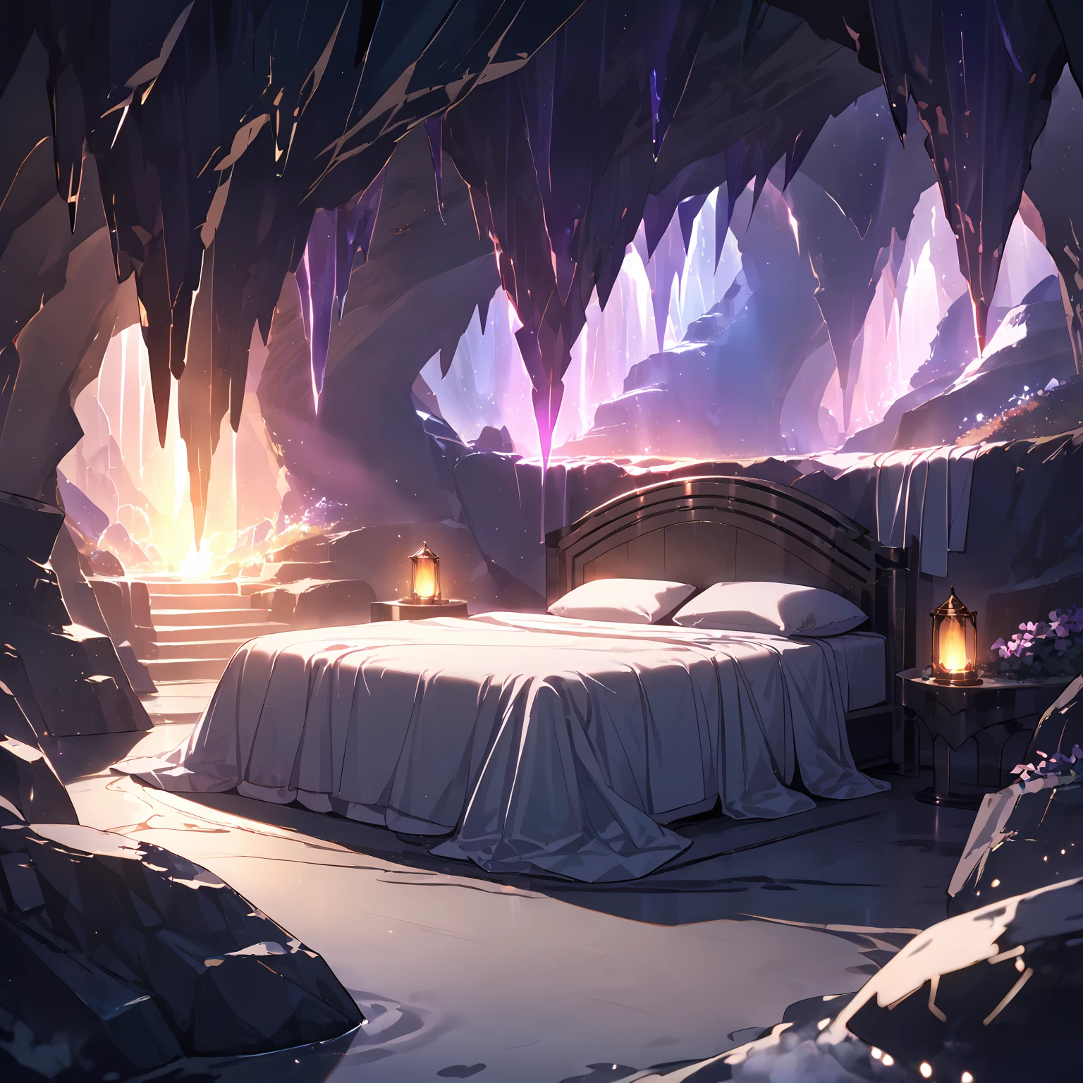 Trigger: mbicmg, cave, stalactite, magical, light, glowing, bed, cave, no humans, scenery