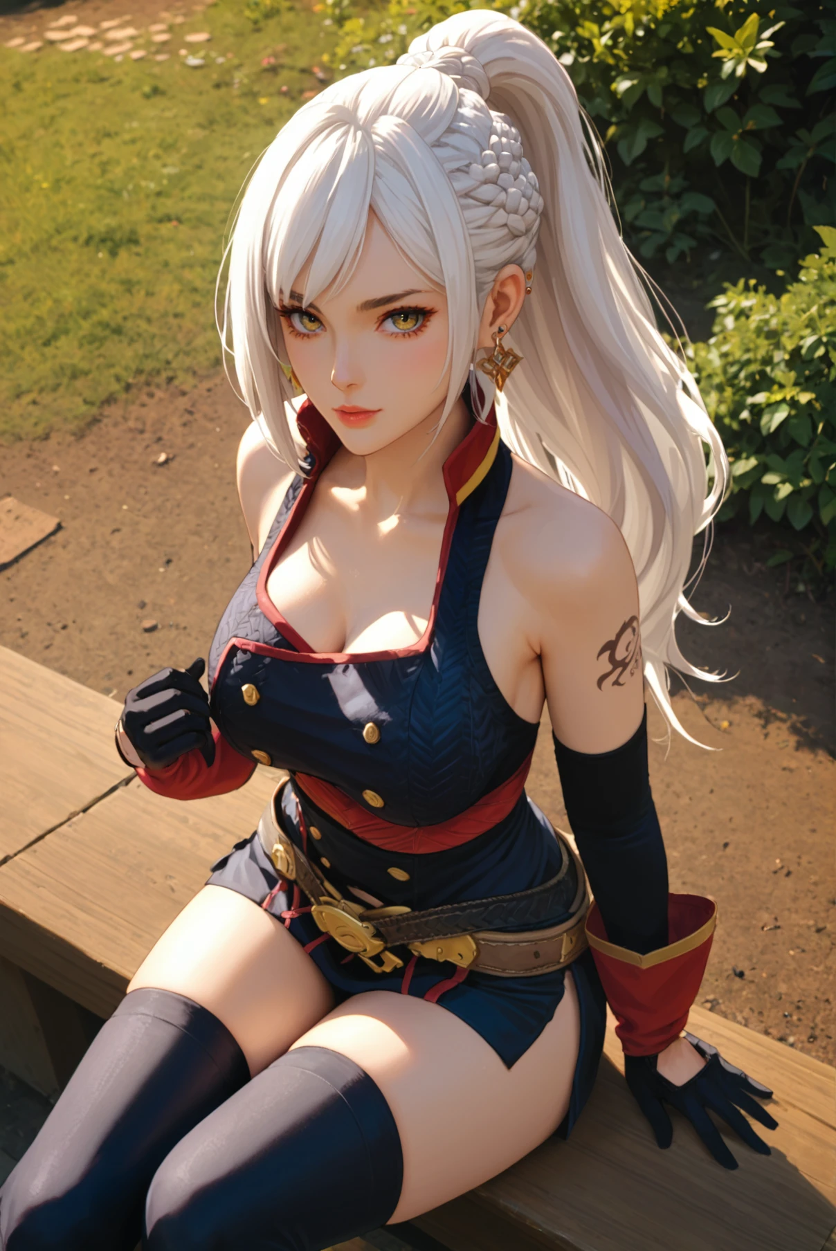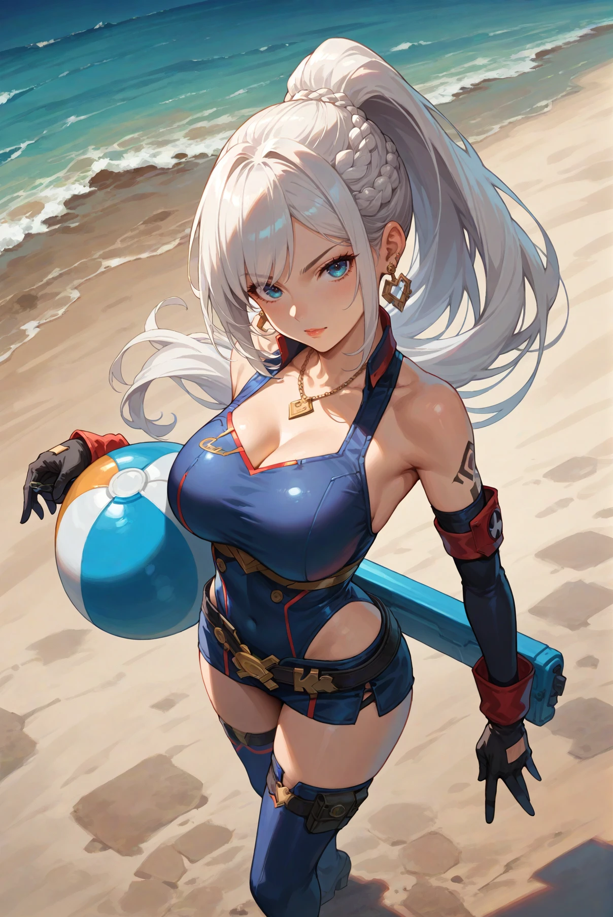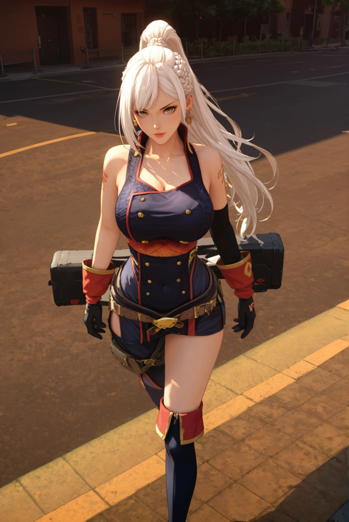 1girl, solo, white hair, braid, ponytail, long hair, earrings, yellow eyes, big breasts, tattoo, gloves, thighhighs, boots, weapon, gun