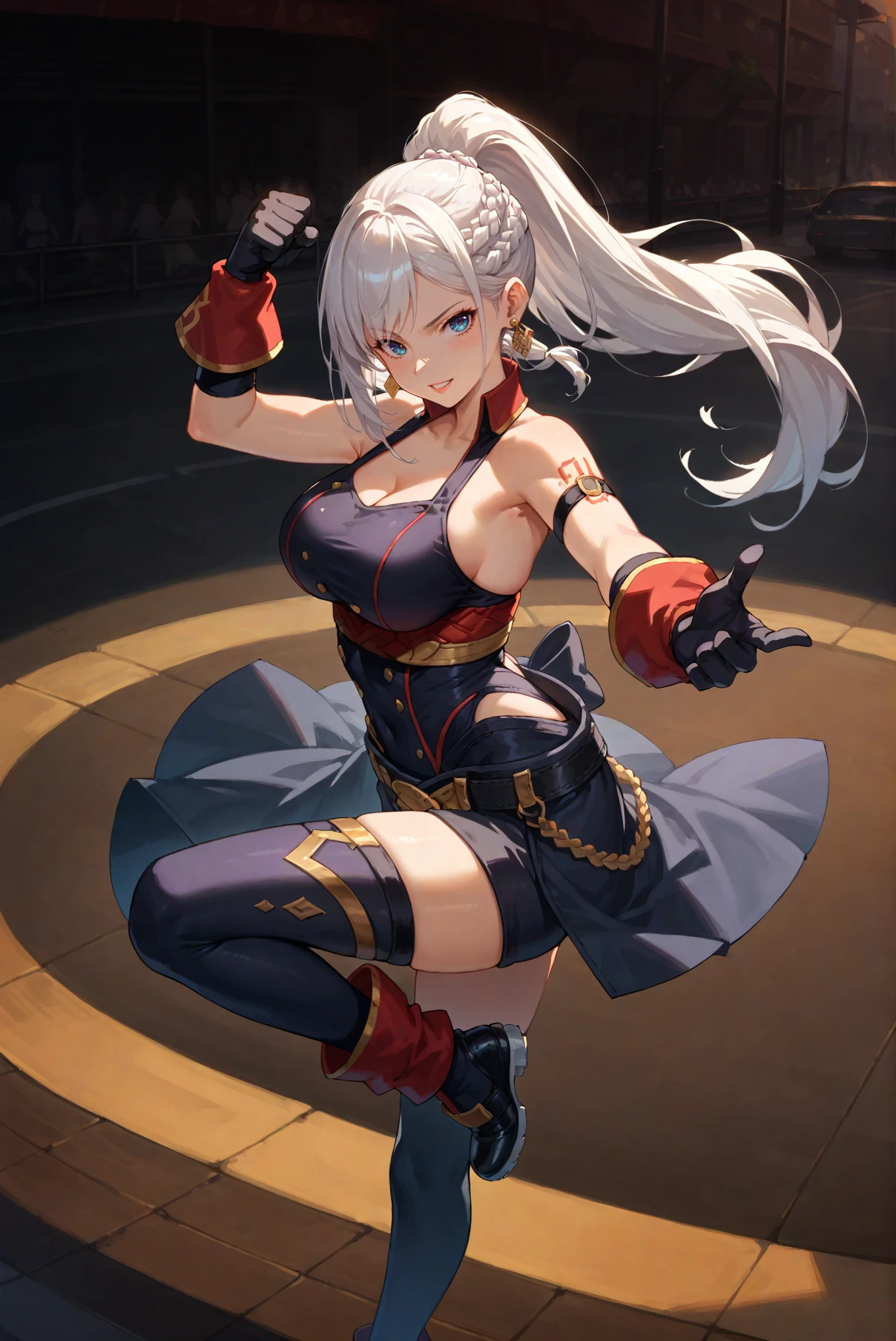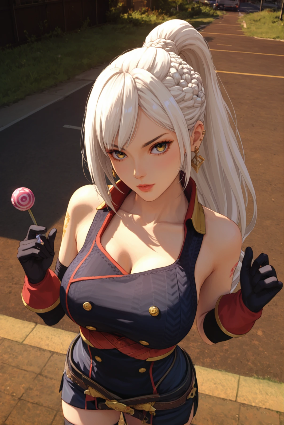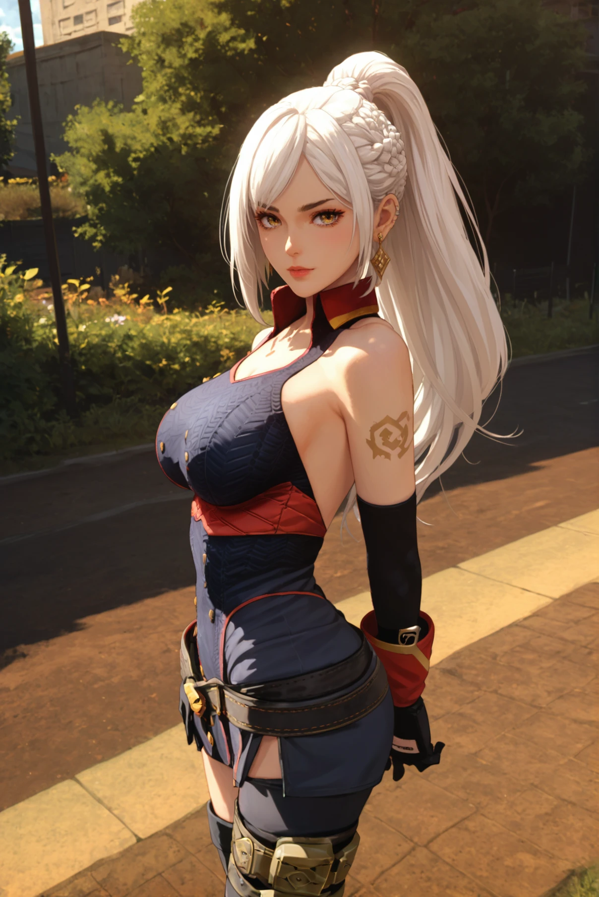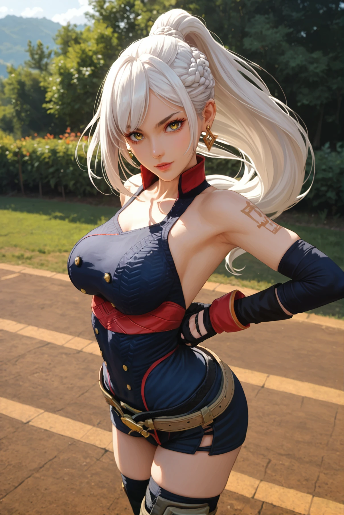 1girl, solo, white hair, braid, ponytail, long hair, earrings, yellow eyes, big breasts, tattoo, gloves, thighhighs, boots, weapon, gun