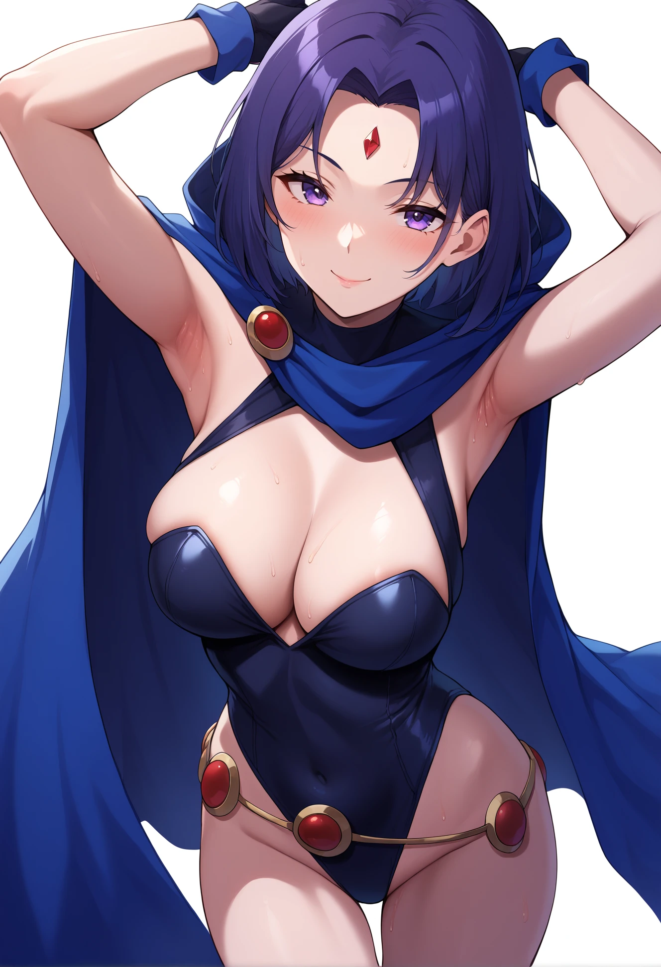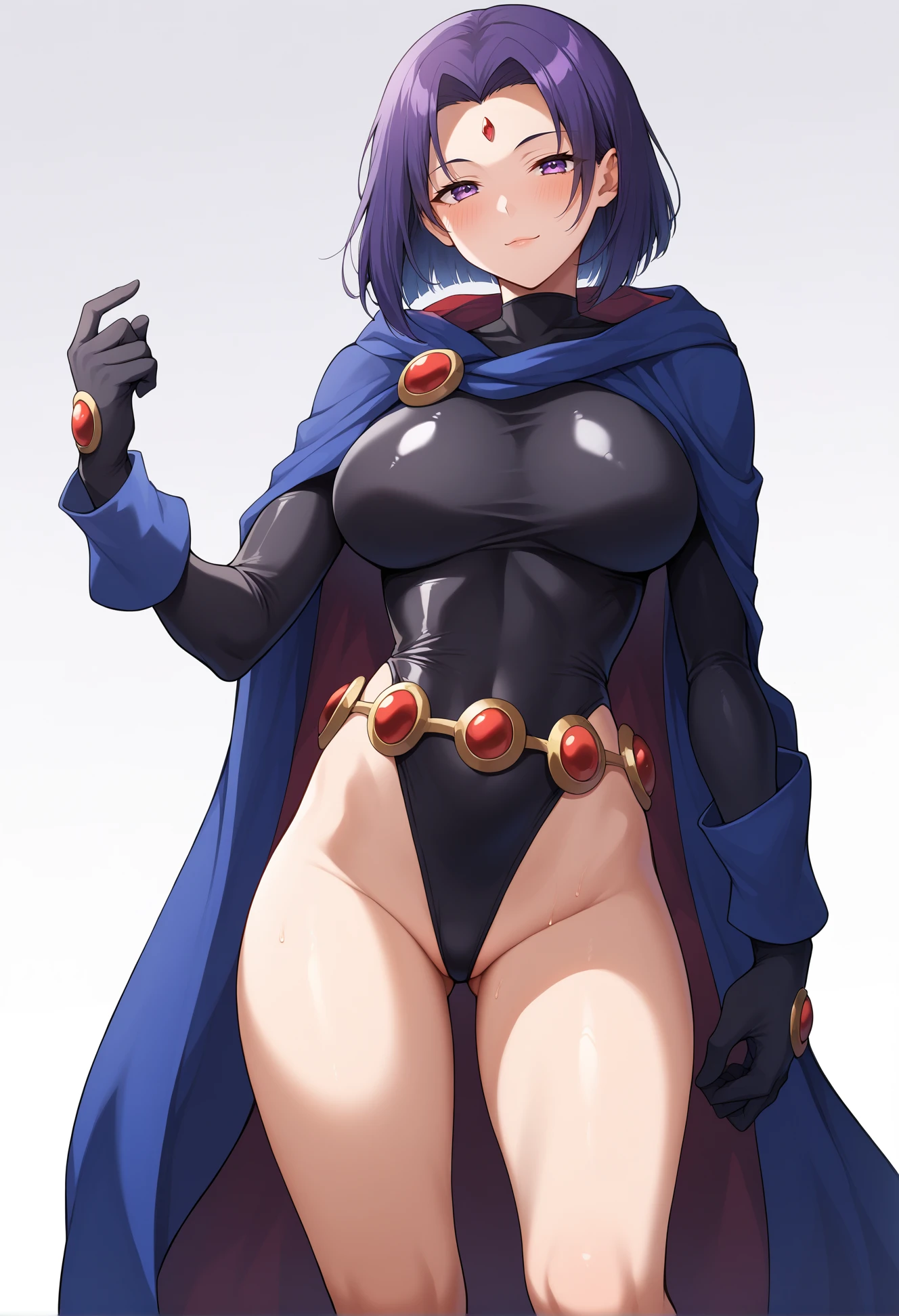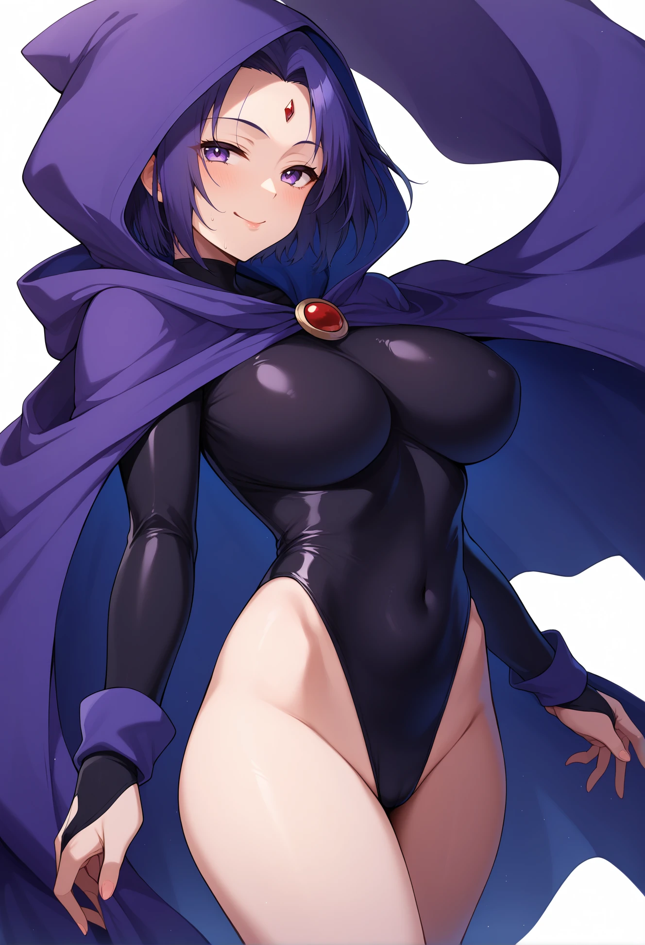 raven_(dc), short hair, colored skin, forehead jewel, grey skin, leotard, cape, belt, thighs, black leotard, highleg, highleg leotard, hood,