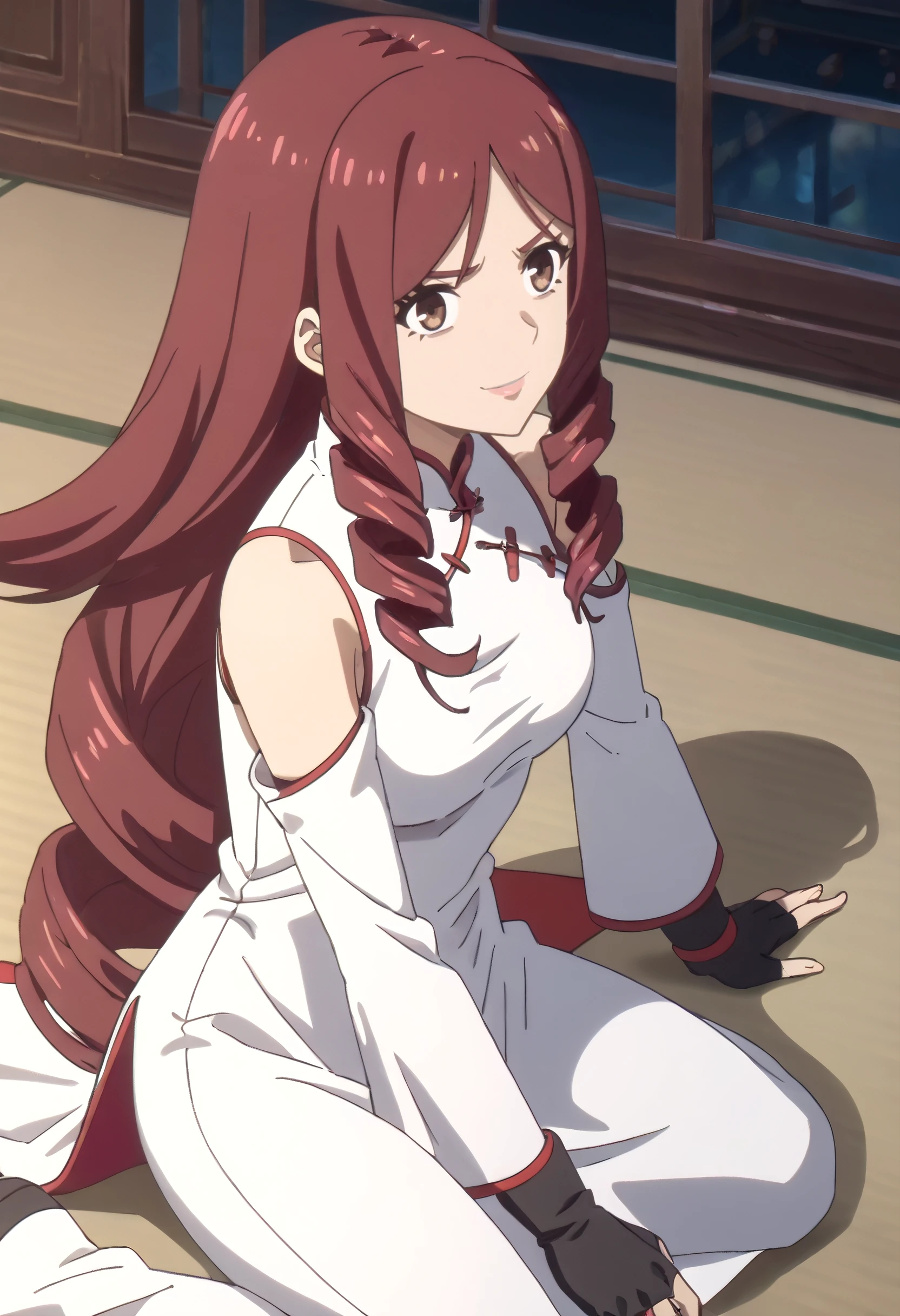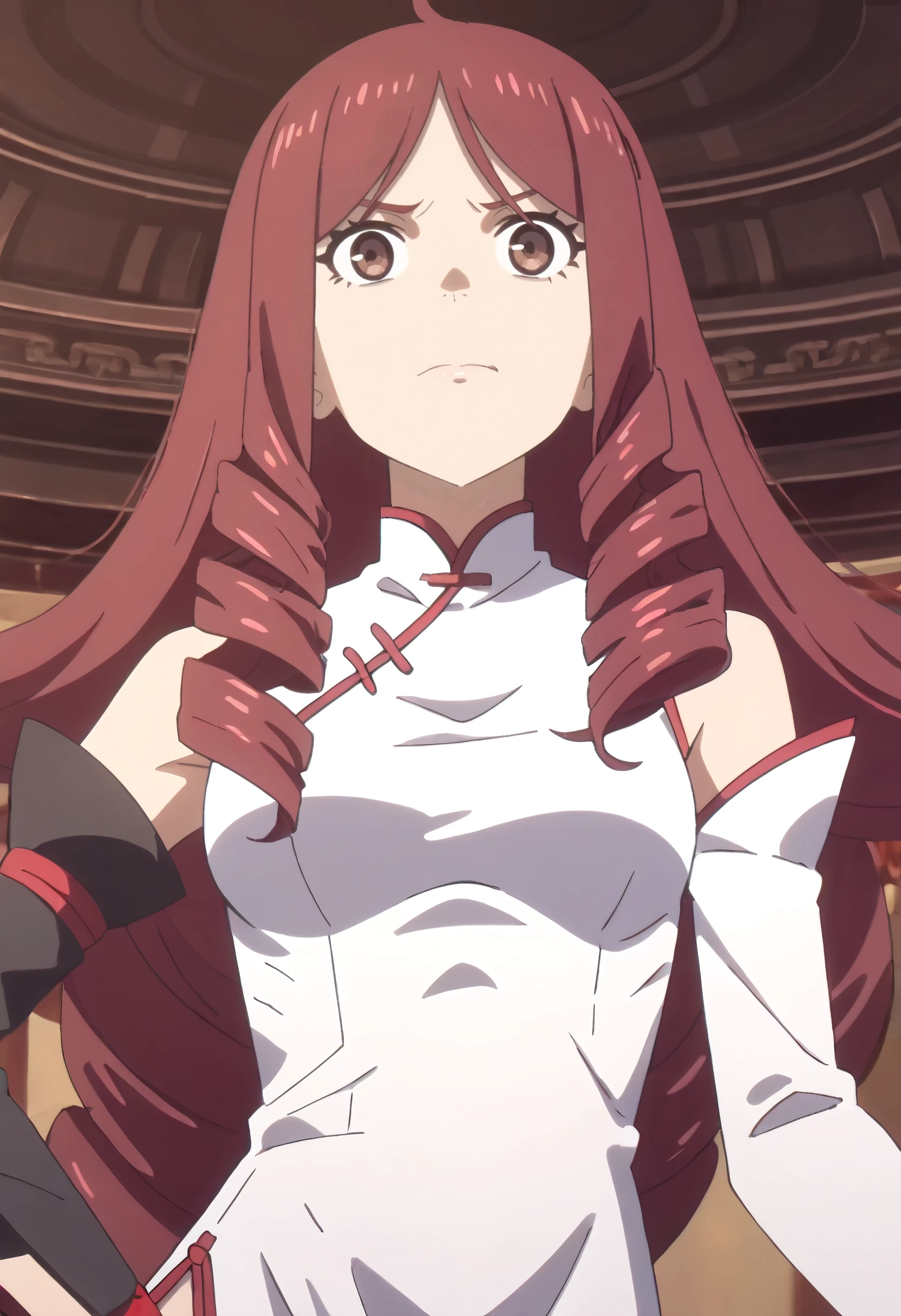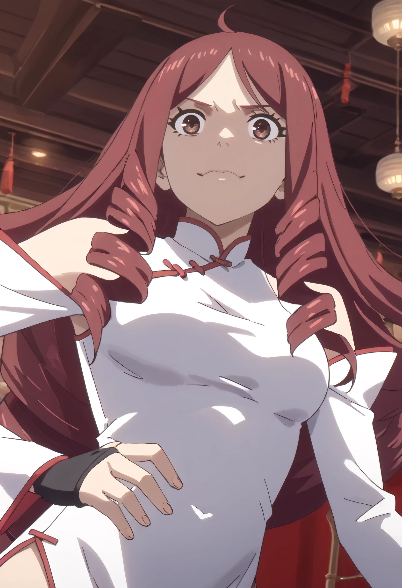 TDLJiangLiuyue, long hair, red hair, brown eyes, bangs, drill hair, hair over shoulder, twin drills,