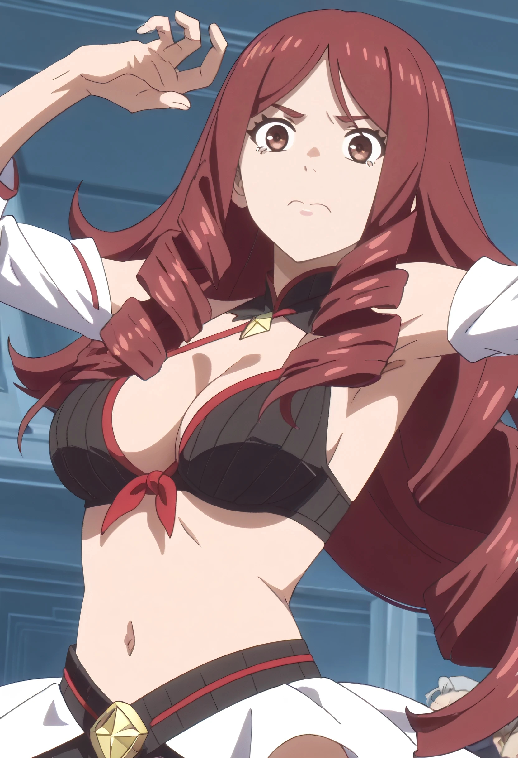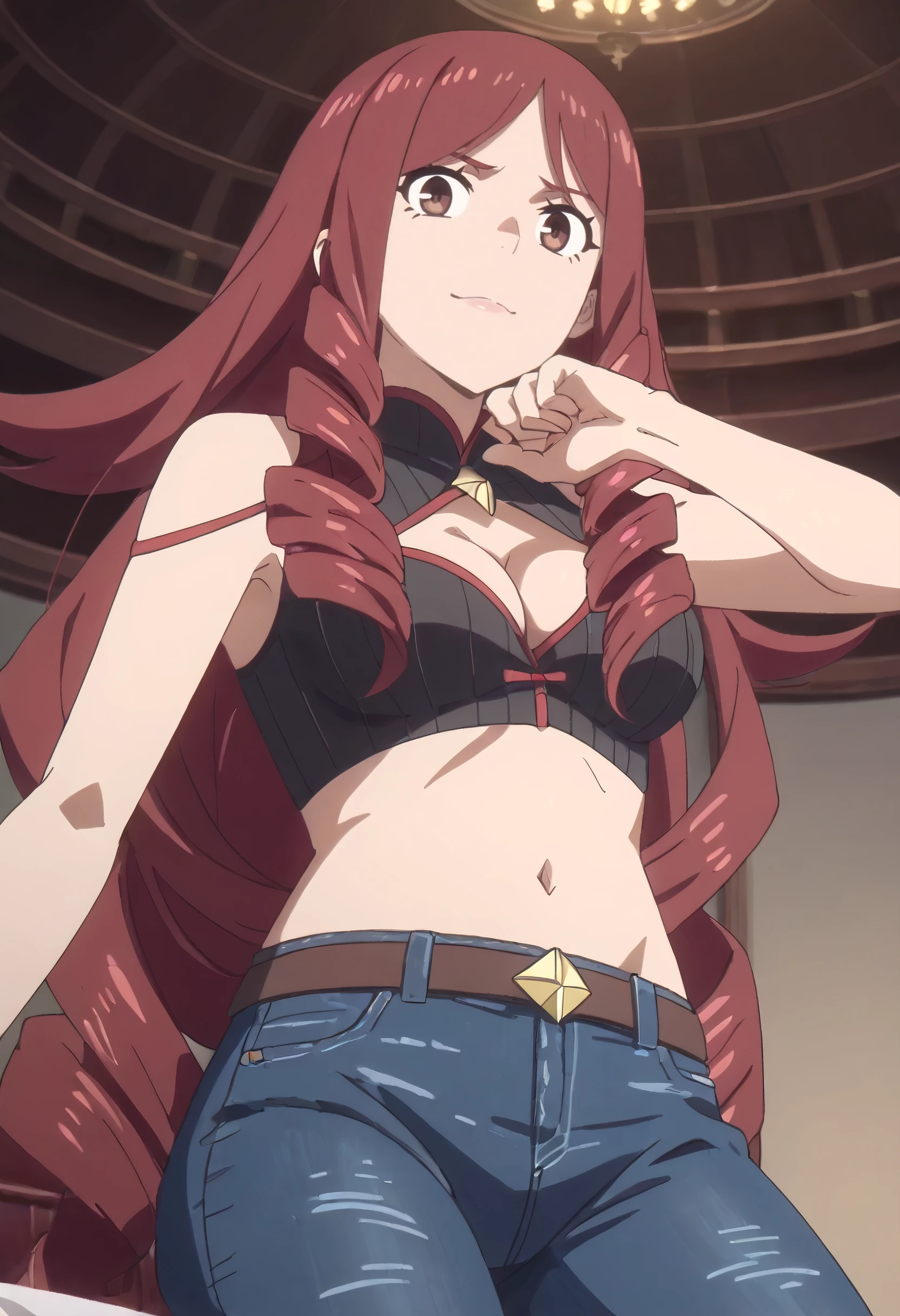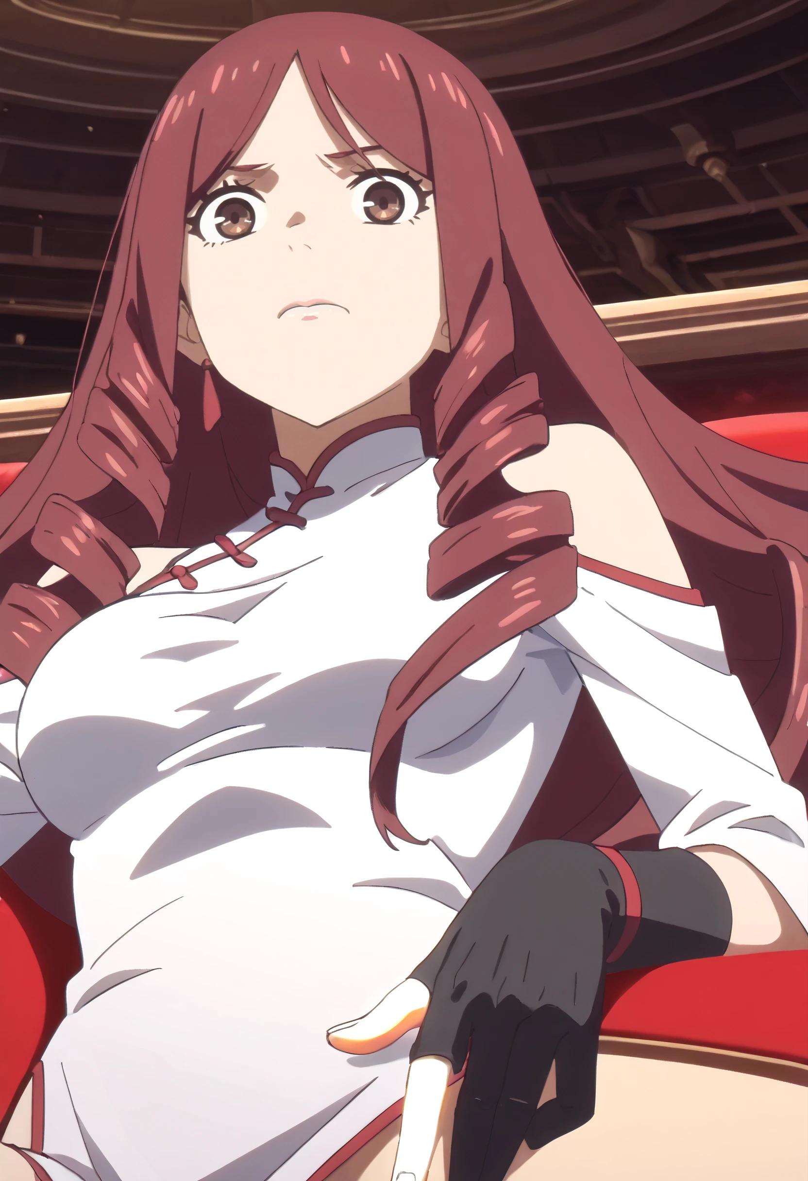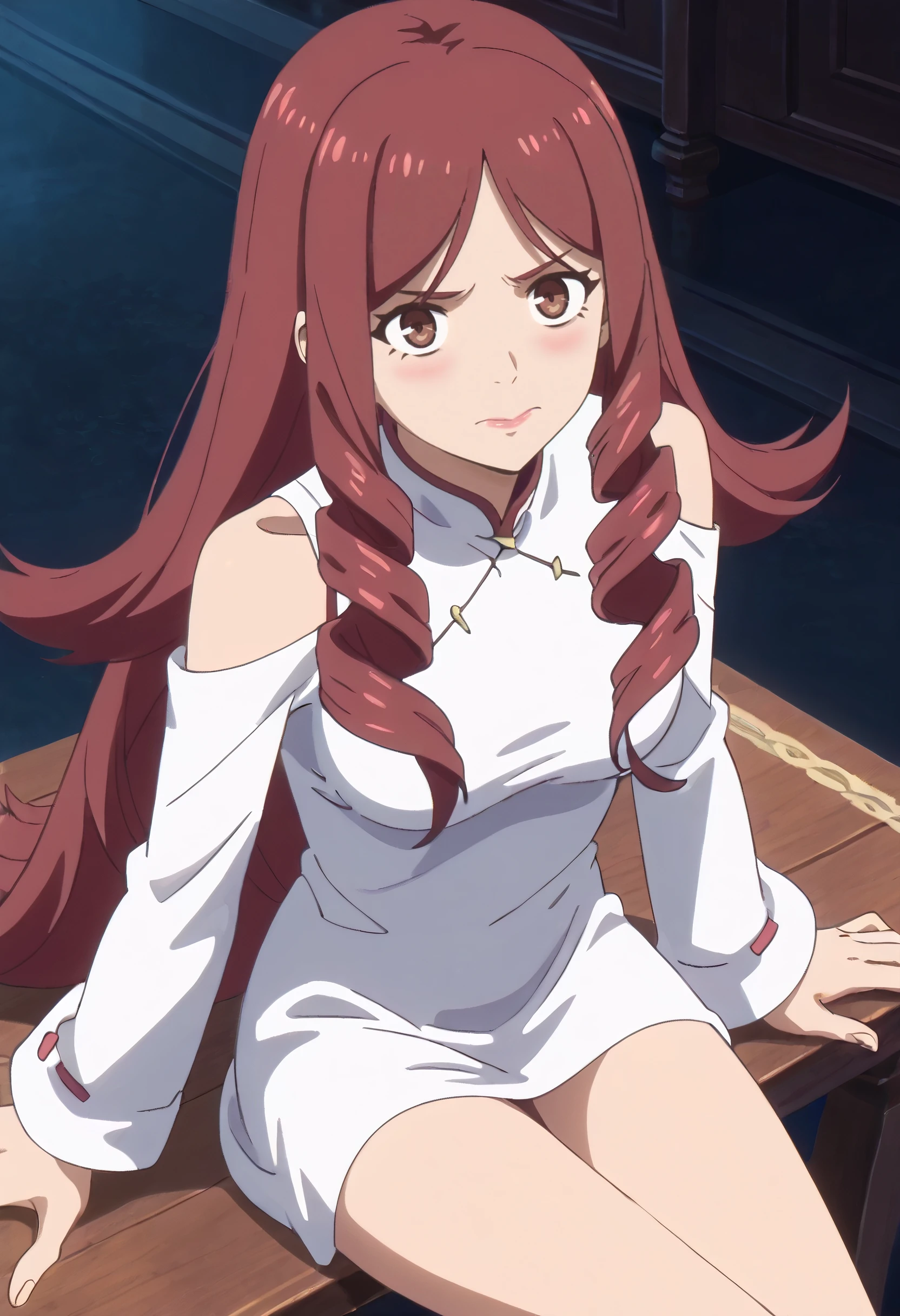 TDLJiangLiuyue, long hair, red hair, brown eyes, bangs, drill hair, hair over shoulder, twin drills,
