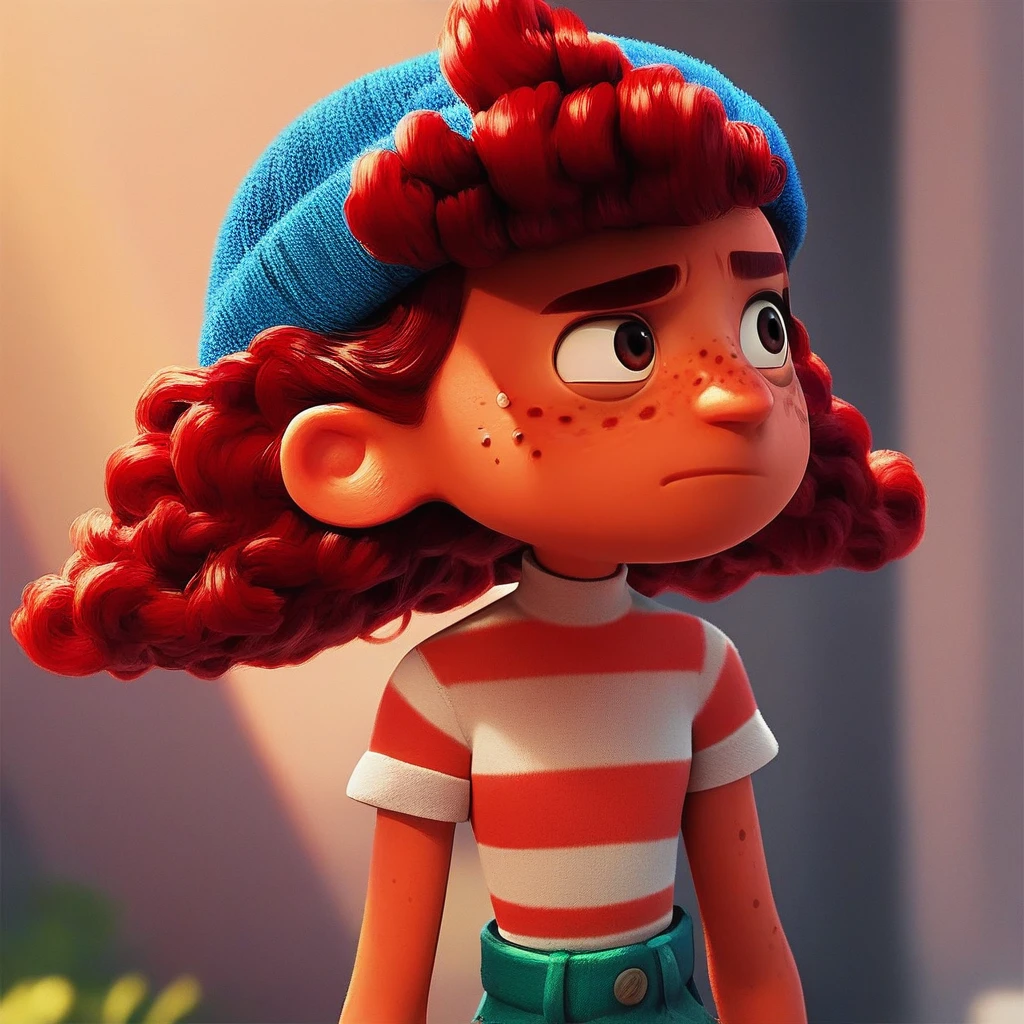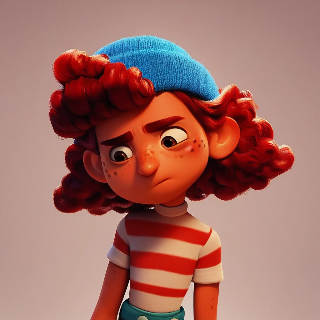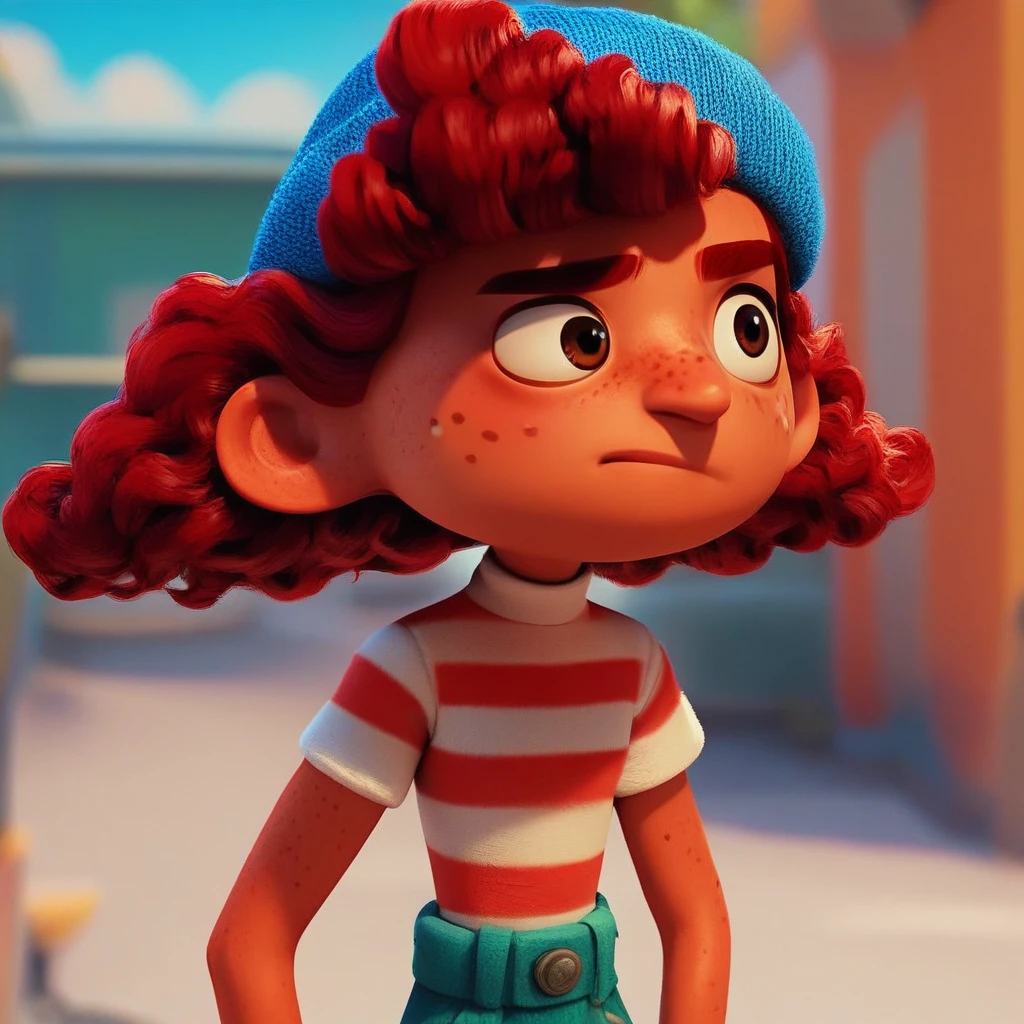 giulia, freckles, red hair, curly hair, striped shirt, hat,