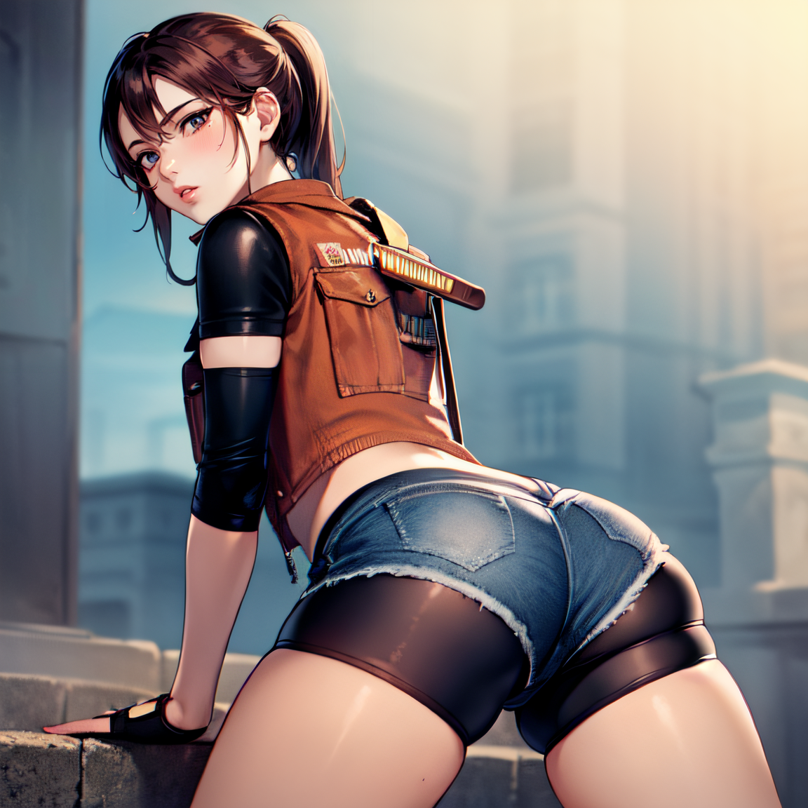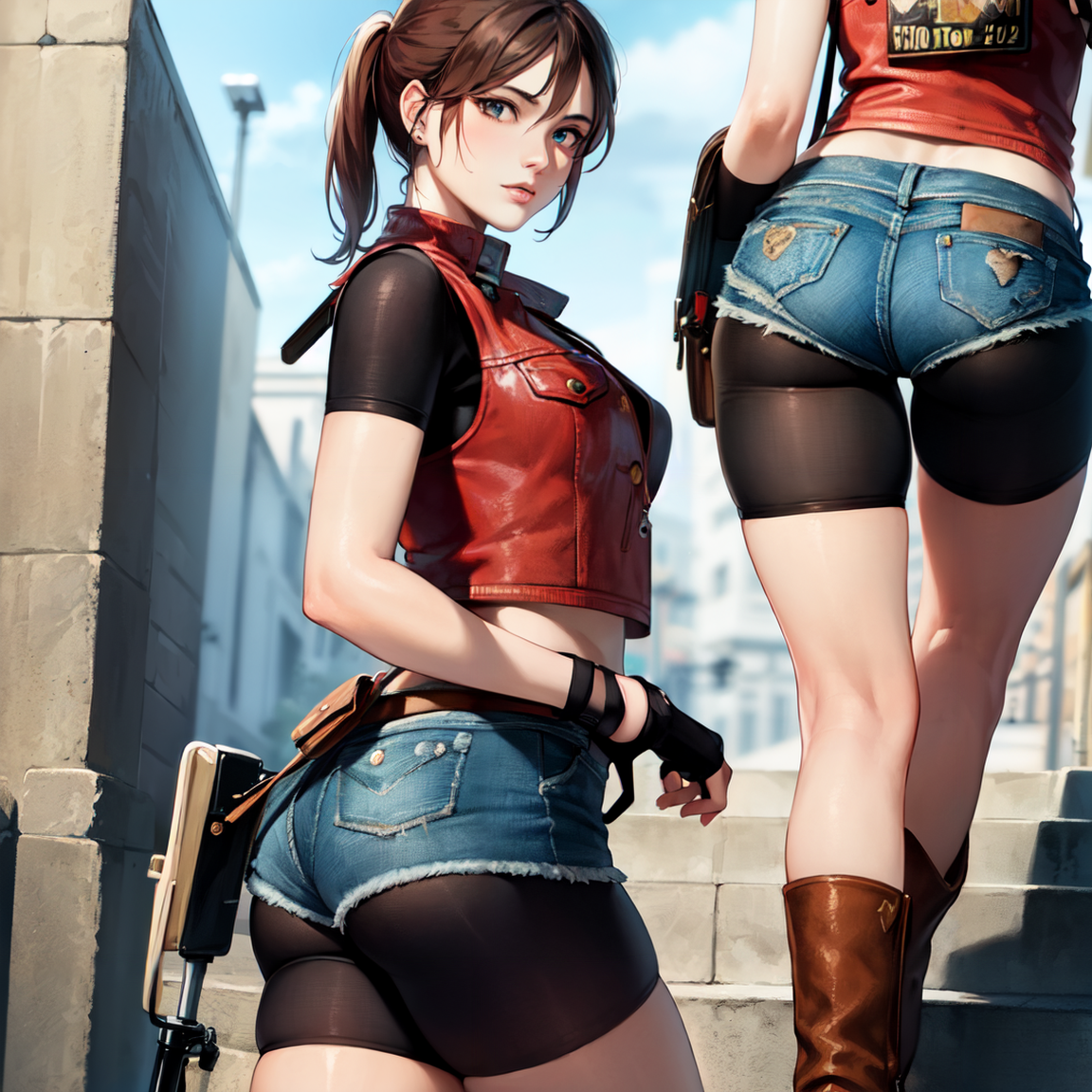 RE 2 classic costume: re2costume, fingerless gloves, boots, bike shorts, denim shorts